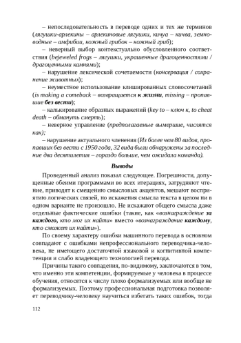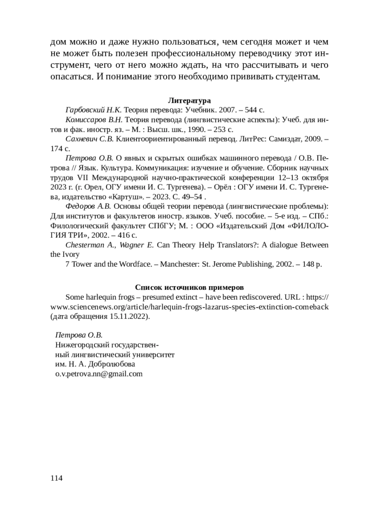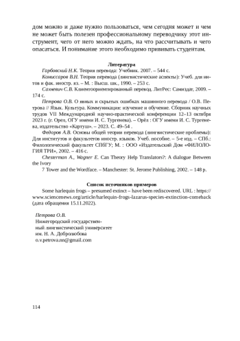 4. 	Петрова О.В. О явных и скрытых ошибках машинного перевода / О.В. Петрова // Язык. Культура. Коммуникация: изучение и обучение. Сборник научных трудов VII Международной научно-практической конференции 12-13 октября 2023 г. (г. Орел, ОГУ имени И. С. Тургенева). - Орёл: ОГУ имени И. С. Тургенева, издательство “Картуш”. - 2023. С. 49-54. EDN: SDXTLH