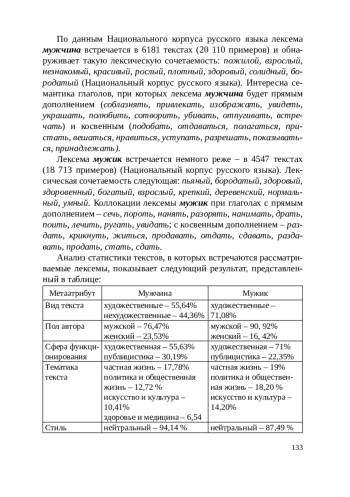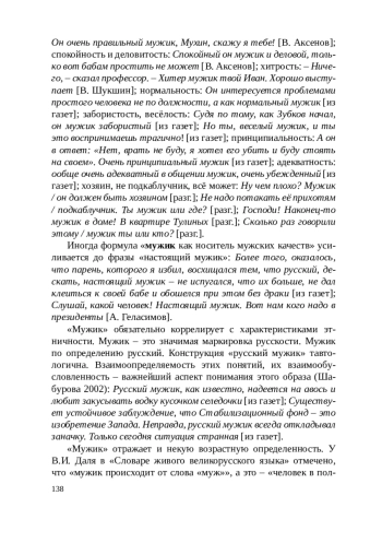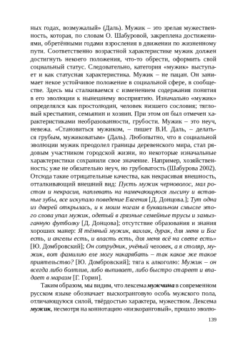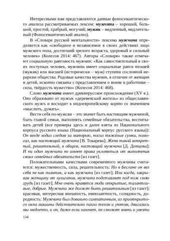 В «Словаре русской ментальности» лексема мужчина определяется как «свободное и независимое в своих действиях лицо мужского пола, достигший зрелого возраста, здоровый и сильный человек» (Колесов 2014: 467). Авторы «Словаря» также отмечают социальную ранговость мужчин: «Как самостоятельный в своих поступках человек, мужчина имеет социальные ранги низшей (мужик) или высшей (исторически – муж) ступени сословной иерархии общества. Родовые качества мужчин, в отличие от женщин и детей, исконно связаны с представлением о воине и работнике – сила, твёрдость мужество» (Колесов 2014: 468).