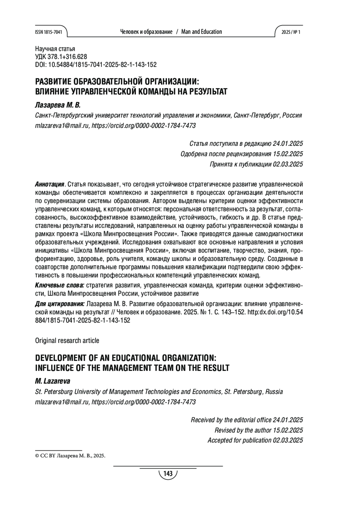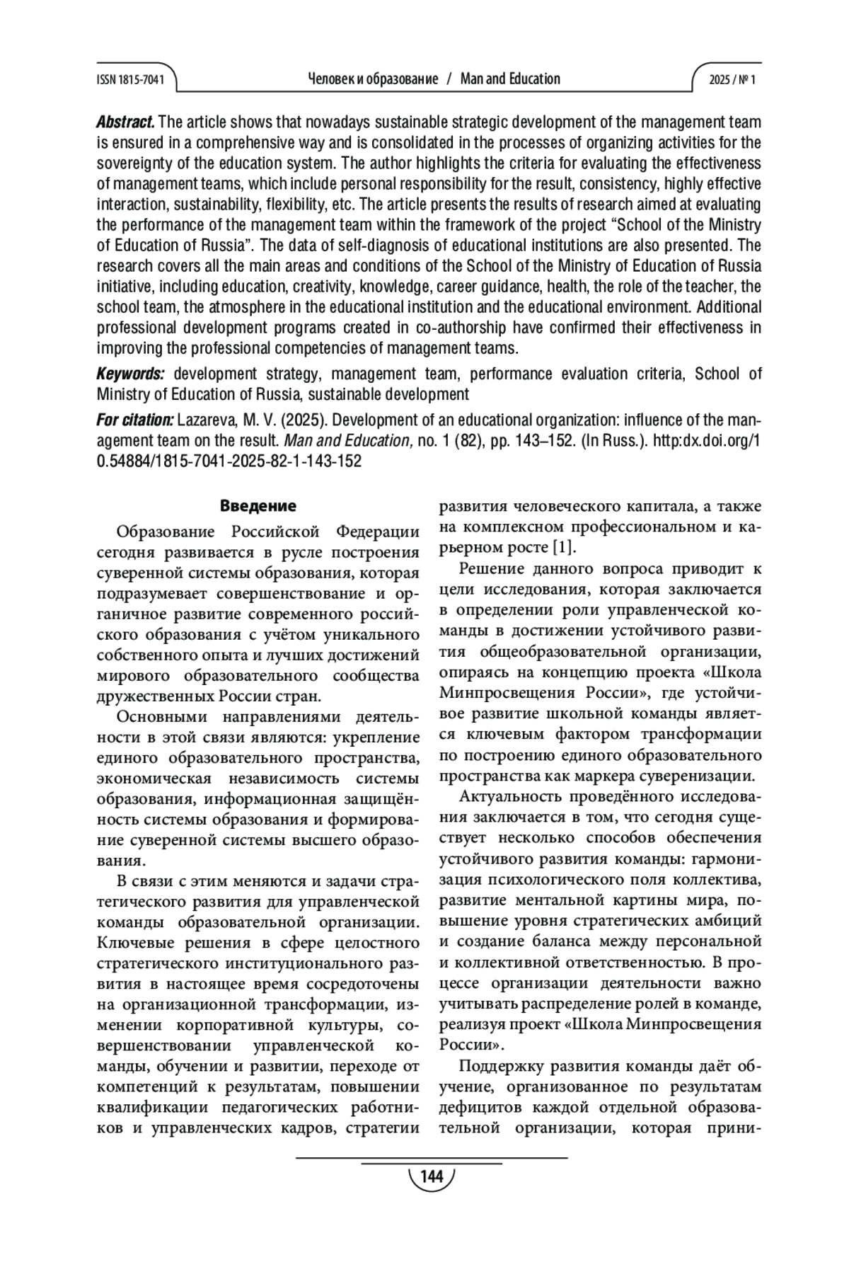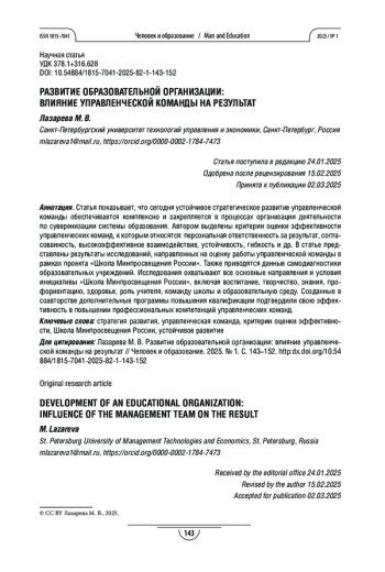 Статья показывает, что сегодня устойчивое стратегическое развитие управленческой команды обеспечивается комплексно и закрепляется в процессах организации деятельности по суверенизации системы образования. Автором выделены критерии оценки эффективности управленческих команд, к которым относятся: персональная ответственность за результат, согласованность, высокоэффективное взаимодействие, устойчивость, гибкость и др. В статье представлены результаты исследований, направленных на оценку работы управленческой команды в рамках проекта «Школа Минпросвещения России». Также приводятся данные самодиагностики образовательных учреждений. Исследования охватывают все основные направления и условия инициативы «Школа Минпросвещения России», включая воспитание, творчество, знания, профориентацию, здоровье, роль учителя, команду школы и образовательную среду. Созданные в соавторстве дополнительные программы повышения квалификации подтвердили свою эффективность в повышении профессиональных компетенций управленческих команд.