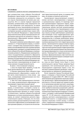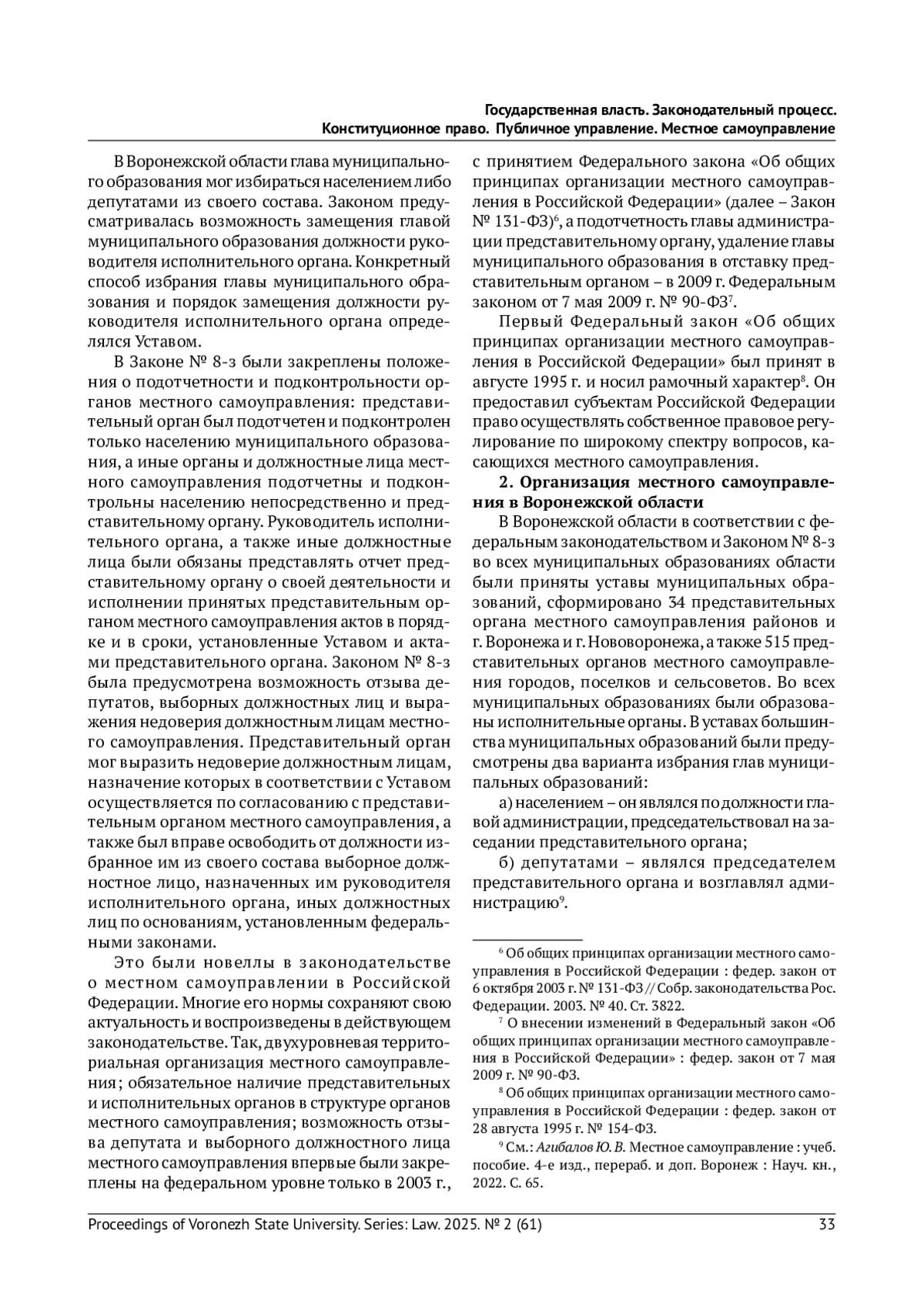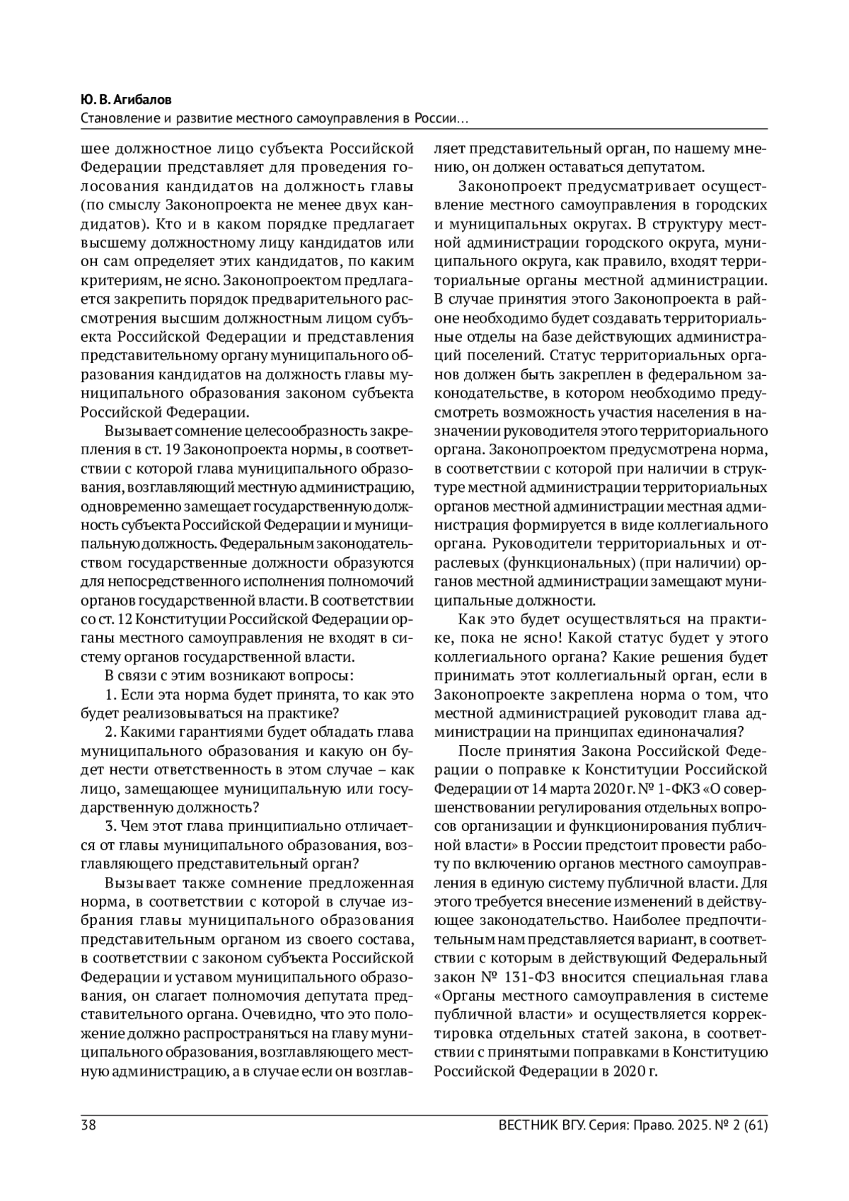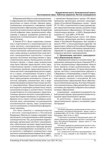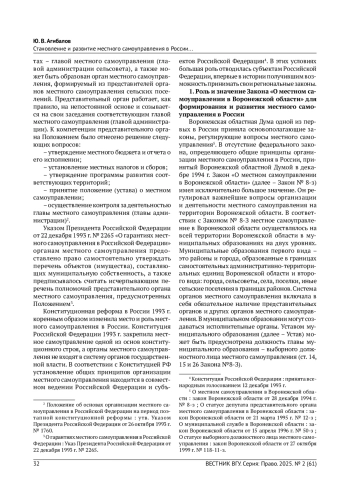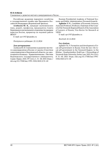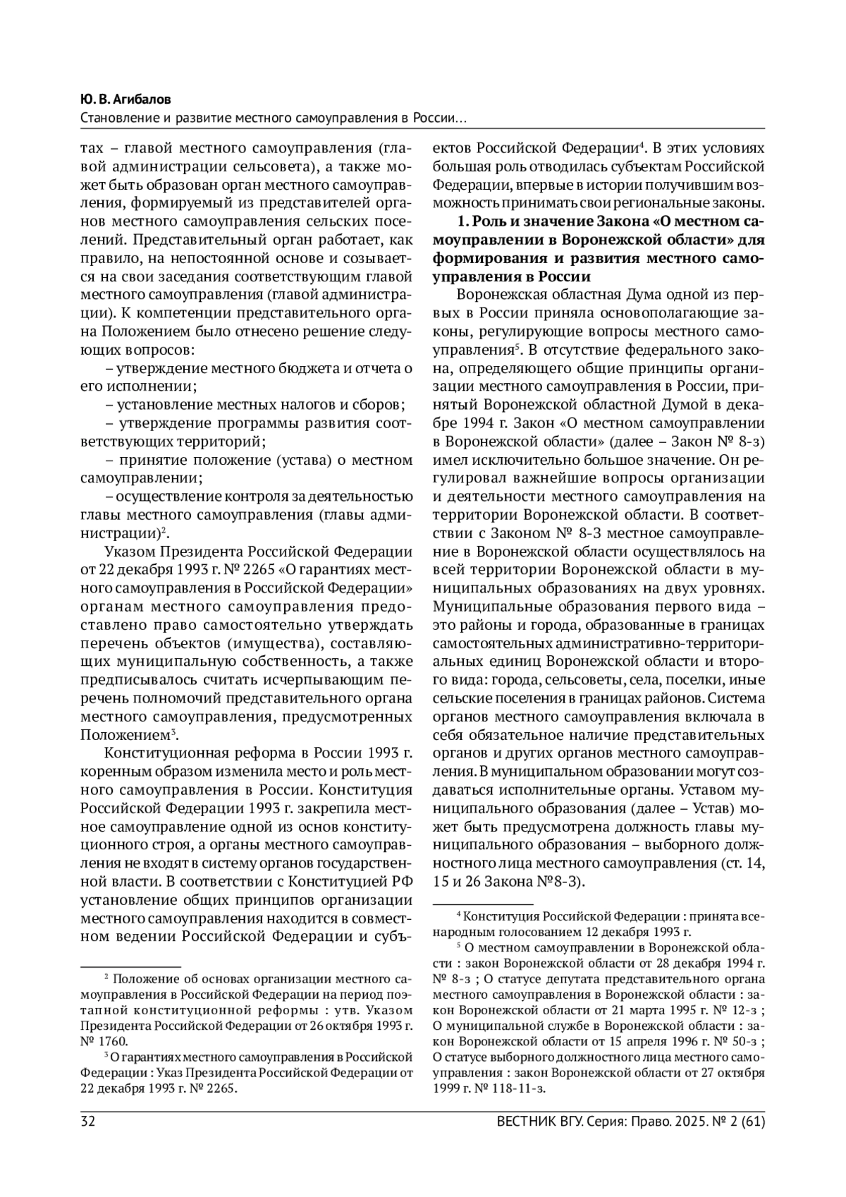 2. 	Агибалов Ю. В. Становление и развитие института главы муниципального образования в России: теоретические и правовые основы // Вестник Воронеж. гос. ун-та. Серия: Право. 2022. № 4. С. 353-365.