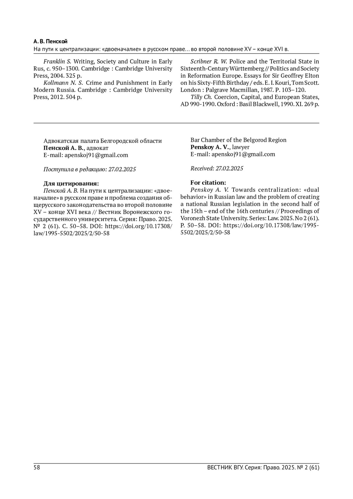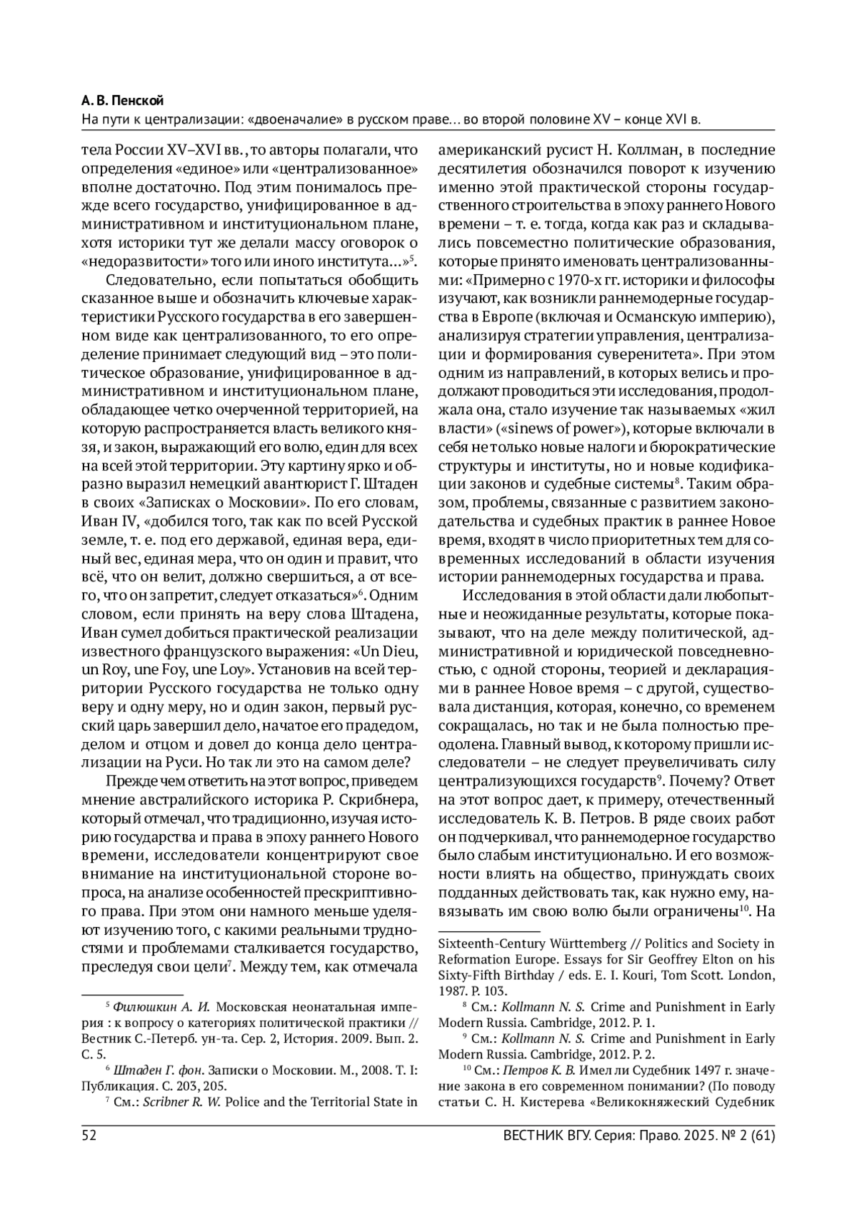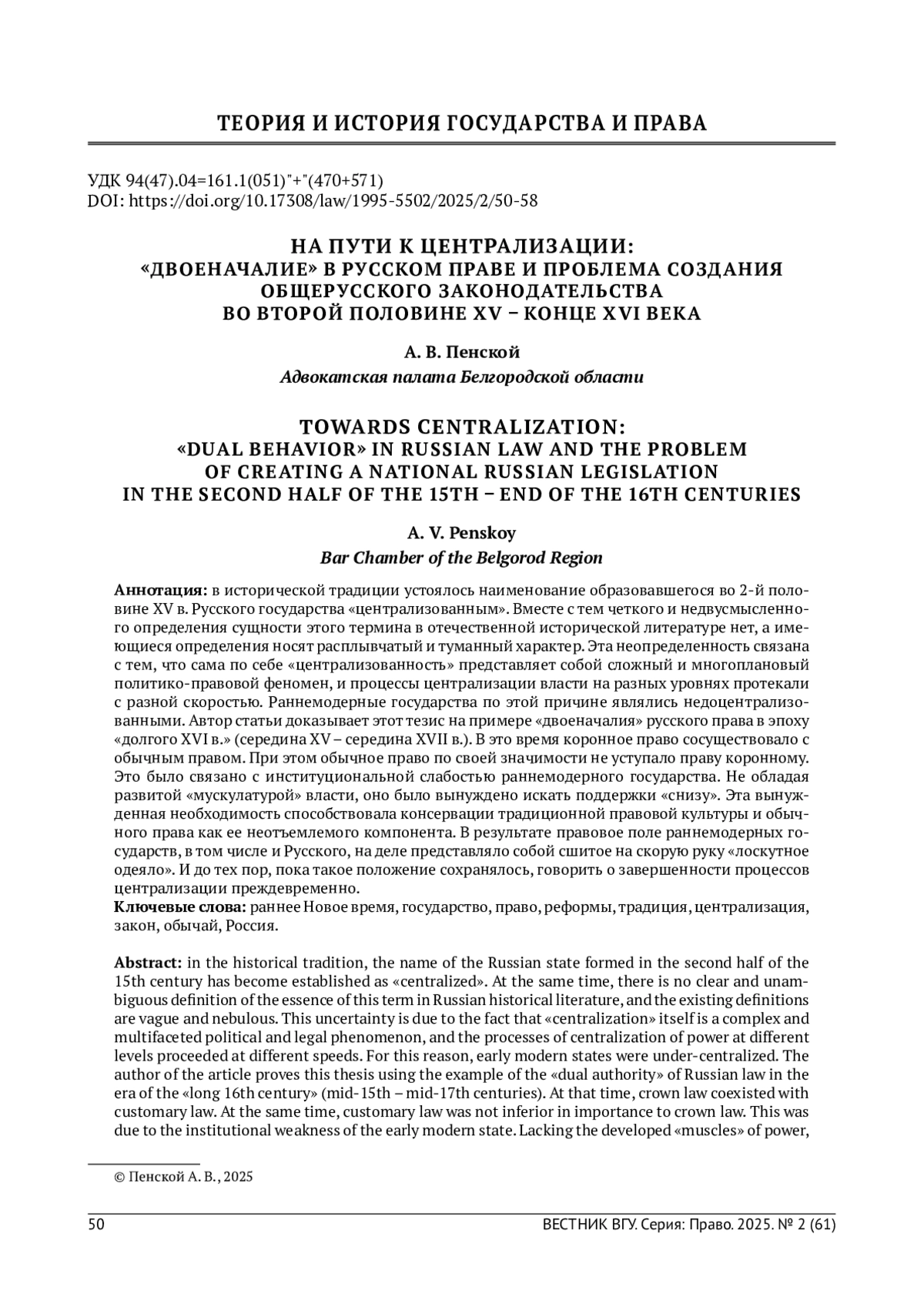 В исторической традиции устоялось наименование образовавшегося во 2-й половине XV в. Русского государства «централизованным». Вместе с тем четкого и недвусмысленного определения сущности этого термина в отечественной исторической литературе нет, а имеющиеся определения носят расплывчатый и туманный характер. Эта неопределенность связана с тем, что сама по себе «централизованность» представляет собой сложный и многоплановый политико-правовой феномен, и процессы централизации власти на разных уровнях протекали с разной скоростью. Раннемодерные государства по этой причине являлись недоцентрализованными. Автор статьи доказывает этот тезис на примере «двоеначалия» русского права в эпоху «долгого XVI в.» (середина XV - середина XVII в.). В это время коронное право сосуществовало с обычным правом. При этом обычное право по своей значимости не уступало праву коронному. Это было связано с институциональной слабостью раннемодерного государства. Не обладая развитой «мускулатурой» власти, оно было вынуждено искать поддержки «снизу». Эта вынужденная необходимость способствовала консервации традиционной правовой культуры и обычного права как ее неотъемлемого компонента. В результате правовое поле раннемодерных государств, в том числе и Русского, на деле представляло собой сшитое на скорую руку «лоскутное одеяло». И до тех пор, пока такое положение сохранялось, говорить о завершенности процессов централизации преждевременно.