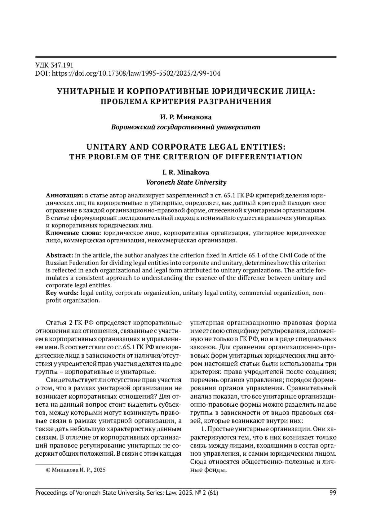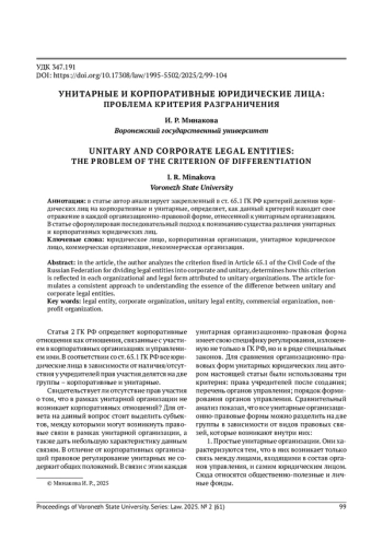 В статье автор анализирует закрепленный в ст. 65.1 ГК РФ критерий деления юридических лиц на корпоративные и унитарные, определяет, как данный критерий находит свое отражение в каждой организационно-правовой форме, отнесенной к унитарным организациям. В статье сформулирован последовательный подход к пониманию существа различия унитарных и корпоративных юридических лиц.