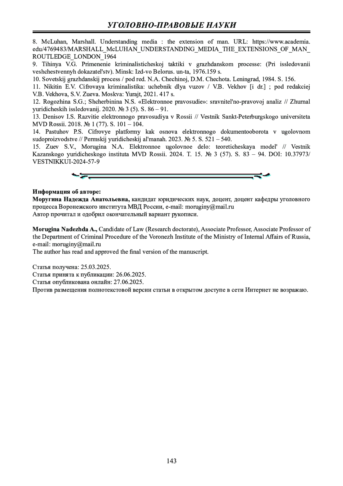 15. 	Зуев С.В., Моругина Н.А. Электронное уголовное дело: теоретическая модель // Вестник Казанского юридического института МВД России. 2024. Т. 15. № 3 (57). С. 83 - 94. DOI: 10.37973/VESTNIKKUI-2024-57-9 EDN: CQSDYT