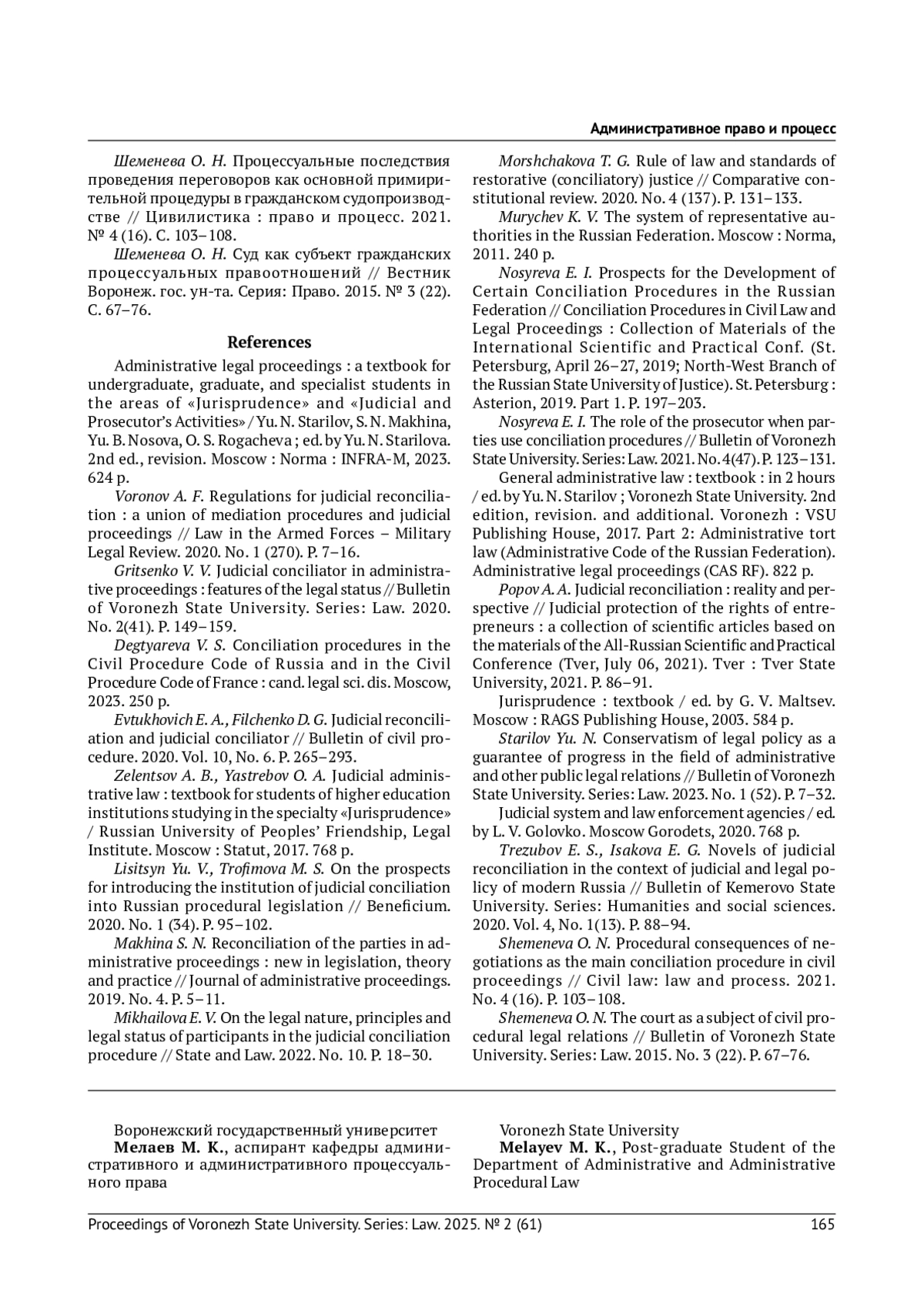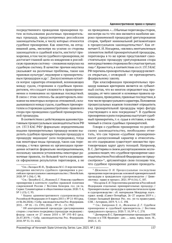 2. 	Воронов А. Ф. Регламент проведения судебного примирения: союз медиативных процедур и судебного разбирательства // Право в Вооруженных Силах - Военно-правовое обозрение. 2020. № 1 (270). С. 7-16. EDN: GYMINW