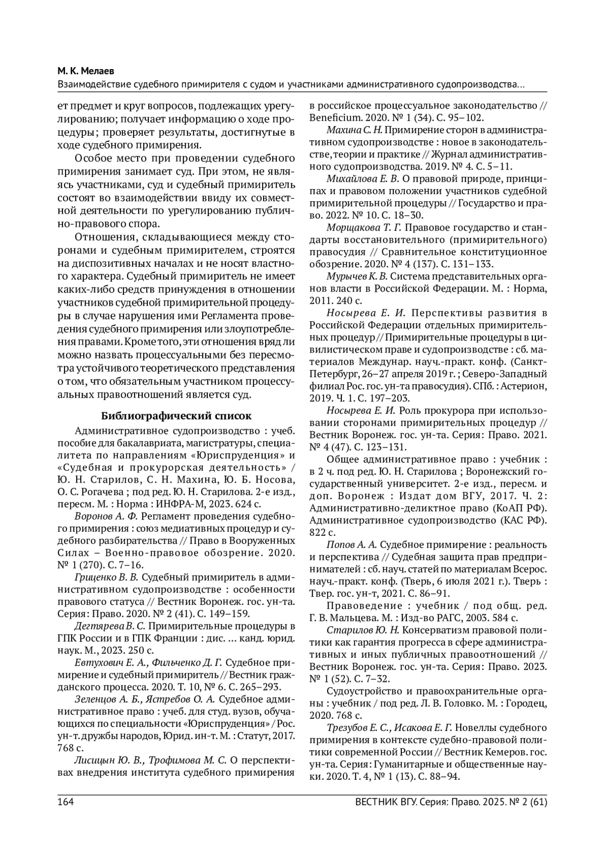 13. 	Носырева Е. И. Роль прокурора при использовании сторонами примирительных процедур // Вестник Воронеж. гос. ун-та. Серия: Право. 2021. № 4 (47). С. 123-131. EDN: WUGAGS