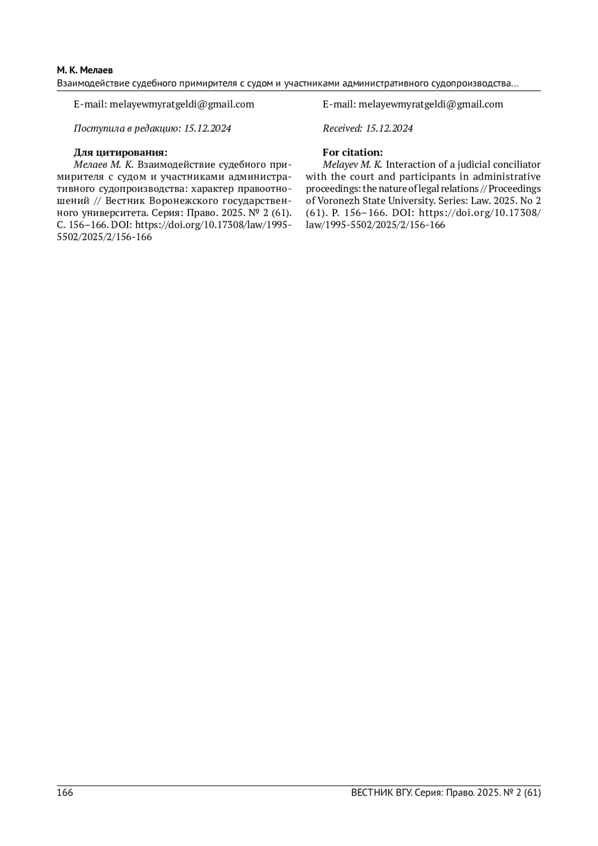 3. 	Гриценко В. В. Судебный примиритель в административном судопроизводстве: особенности правового статуса // Вестник Воронеж. гос. ун-та. Серия: Право. 2020. № 2 (41). С. 149-159. EDN: LXLTGL