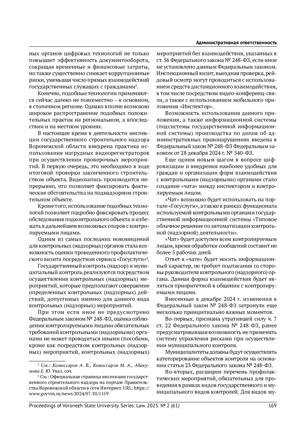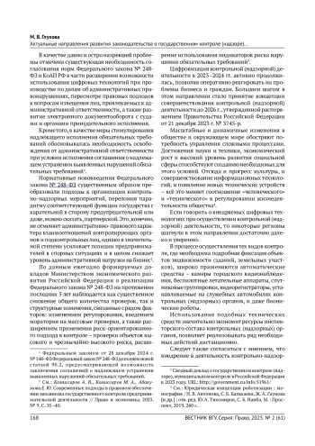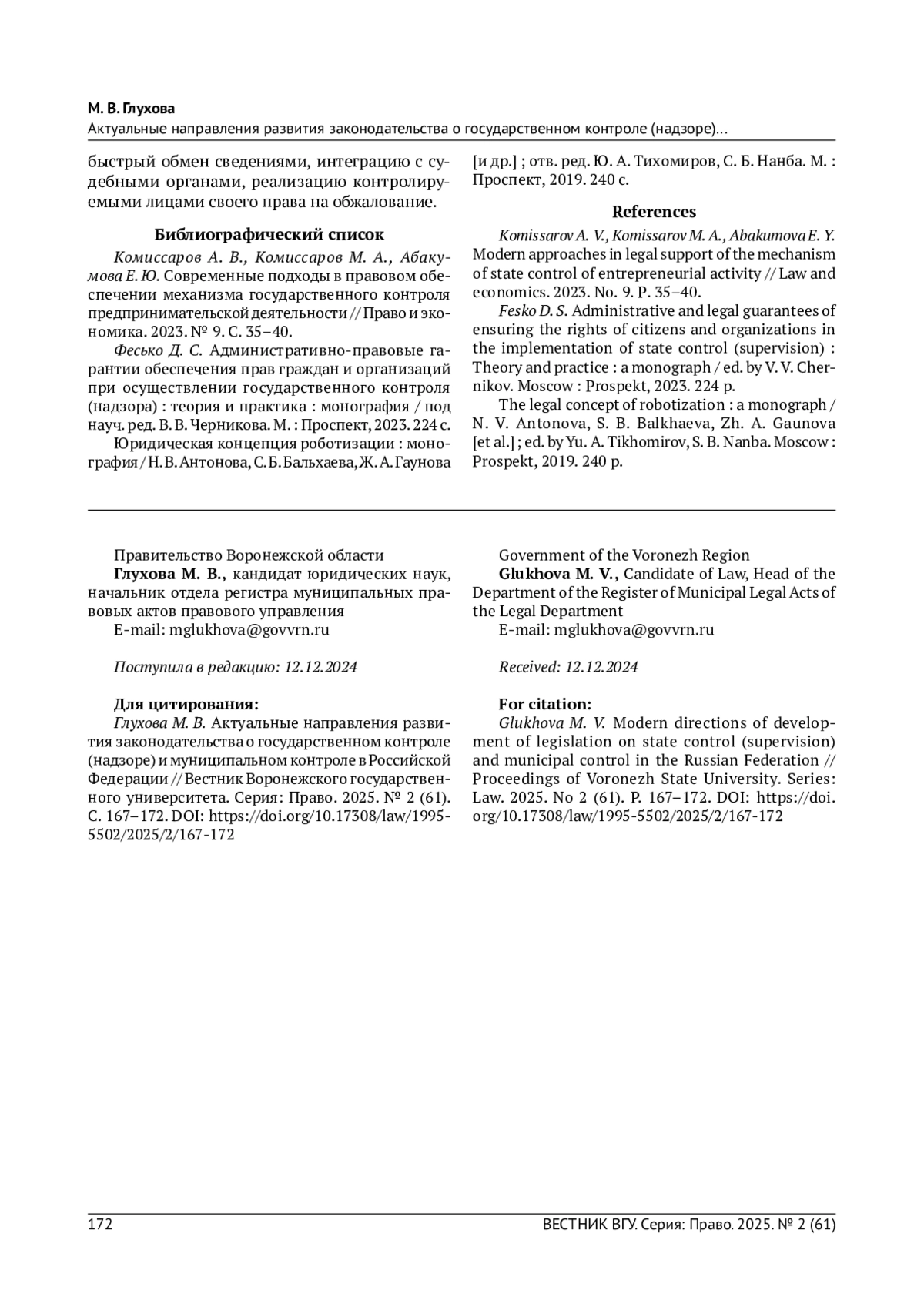 1. 	Комиссаров А. В., Комиссаров М. А., Абакумова Е. Ю. Современные подходы в правовом обеспечении механизма государственного контроля предпринимательской деятельности // Право и экономика. 2023. № 9. С. 35-40. EDN: HELVGW