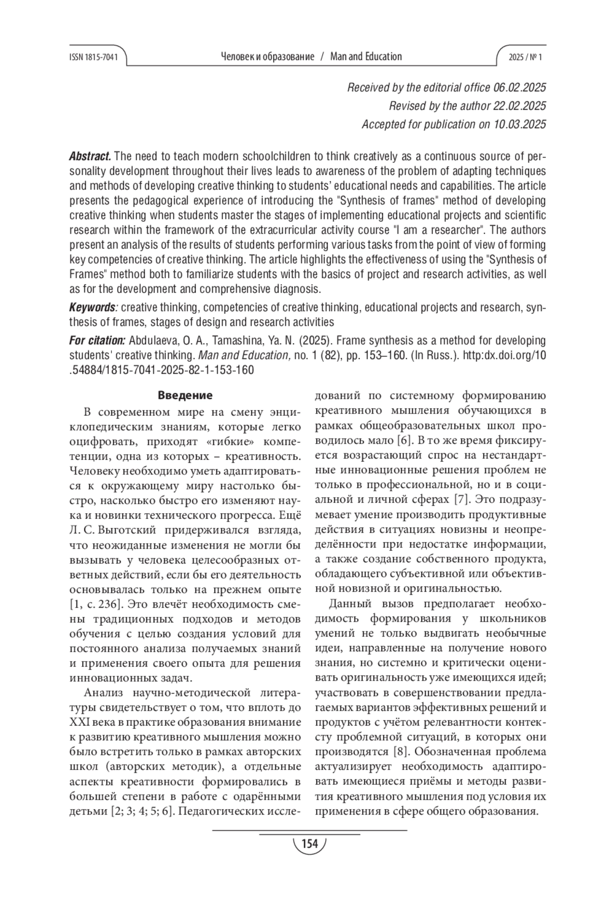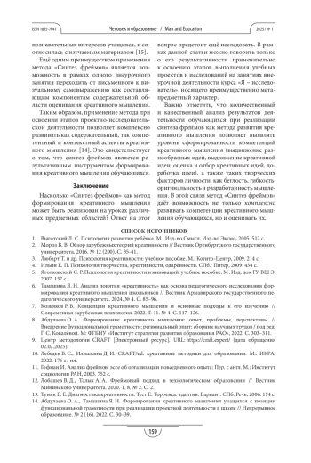 6. Тамашина Я. Н. Анализ понятия «креативность» как основа педагогического исследования формирования креативного мышления школьников // Вестник Армавирского государственного педагогического университета. 2024. № 4. С. 85-96.