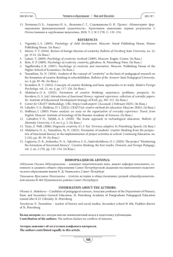 14. Абдулаева О. А., Тамашина Я. Н. Формирования креативного мышления учащихся с позиции функциональной грамотности при реализации проектной деятельности в школе // Непрерывное образование. № 2 (16). 2022. С. 30-39.