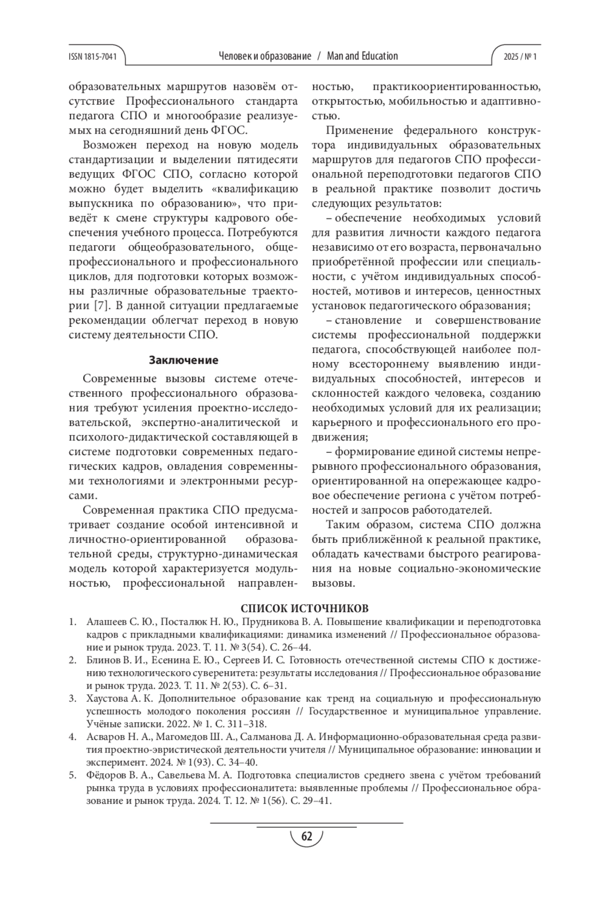 5. Фёдоров В. А., Савельева М. А. Подготовка специалистов среднего звена с учётом требований рынка труда в условиях профессионалитета: выявленные проблемы // Профессиональное образование и рынок труда. 2024. Т. 12. № 1(56). С. 29-41.