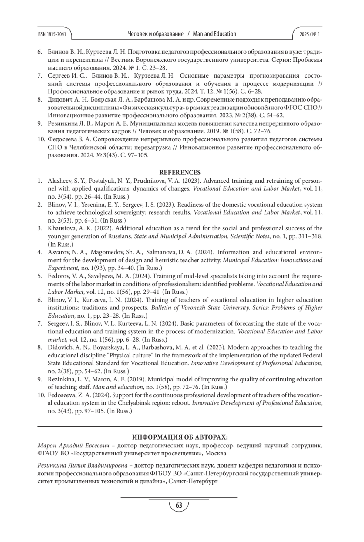6. Блинов В. И., Куртеева Л. Н. Подготовка педагогов профессионального образования в вузе: традиции и перспективы // Вестник Воронежского государственного университета. Серия: Проблемы высшего образования. 2024. № 1. С. 23-28.