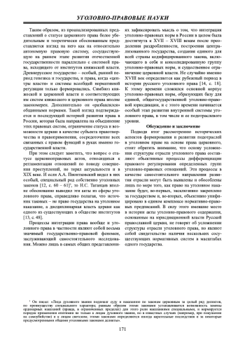 Подотрасли уголовного права, несмотря на все сложности, связанные с их теоретической интерпретацией, отсутствие устоявшегося взгляда на сам факт их наличия в структуре современного права и относительно позднее появление в научном дискурсе, не исключены из сферы исторического исследования. Вместе с тем их исторический анализ, чтобы быть достоверным и эффективным, должен учитывать некоторые организационные особенности, связанные с тем, что подотрасль, во-первых, является результатом не просто ординарного нормотворчества, но и во многом теоретического обобщения нормативного материала, и во-вторых, как результат такого обобщения она может существовать лишь в условиях достаточно развитого уголовного права на сравнительно позднем этапе его эволюции. Эти обстоятельства порождают закономерные, но вполне преодолимые сложности в поиске генетических оснований и направлений развития современных теоретико-нормативных конструкций, не имеющих прямых аналогов в прошлом.