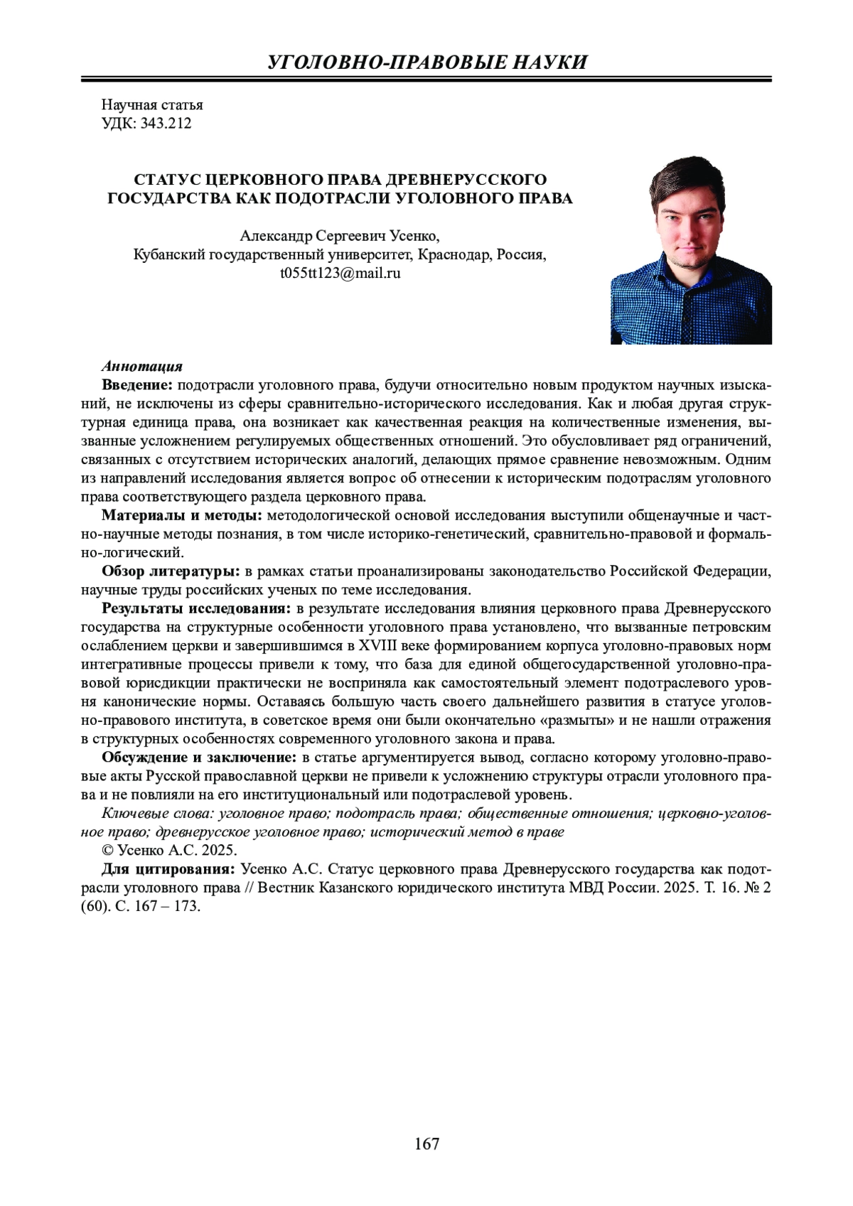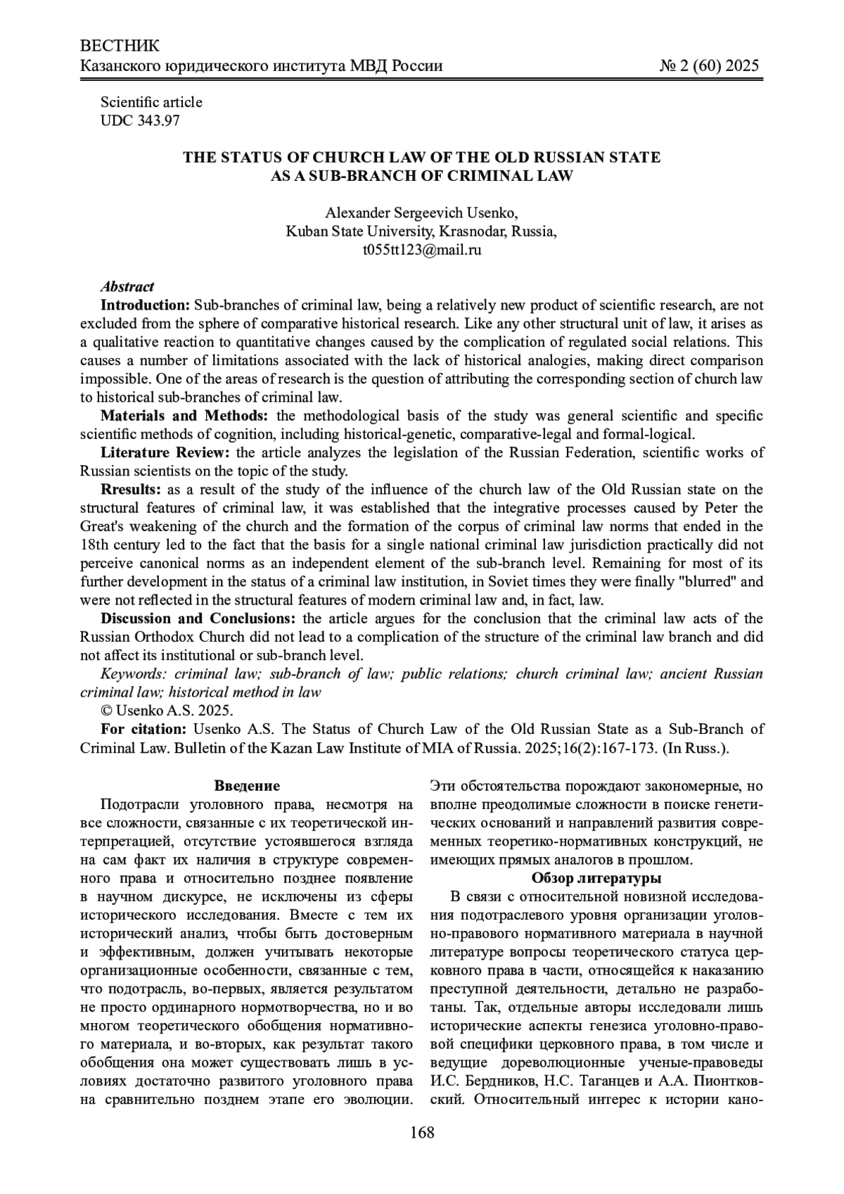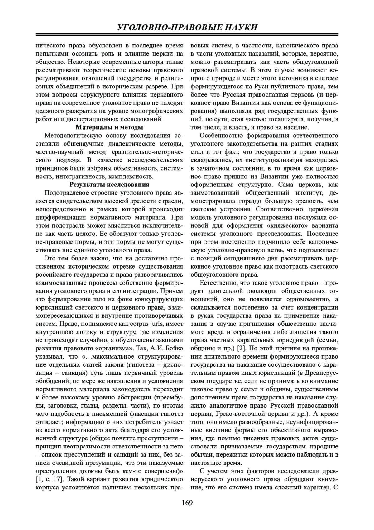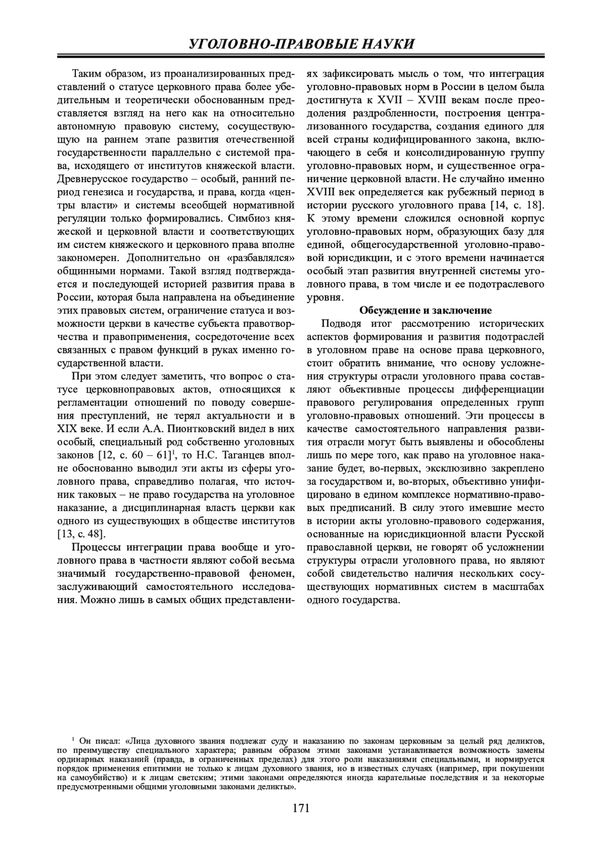 Введение: подотрасли уголовного права, будучи относительно новым продуктом научных изысканий, не исключены из сферы сравнительно-исторического исследования. Как и любая другая структурная единица права, она возникает как качественная реакция на количественные изменения, вызванные усложнением регулируемых общественных отношений. Это обусловливает ряд ограничений, связанных с отсутствием исторических аналогий, делающих прямое сравнение невозможным. Одним из направлений исследования является вопрос об отнесении к историческим подотраслям уголовного права соответствующего раздела церковного права.