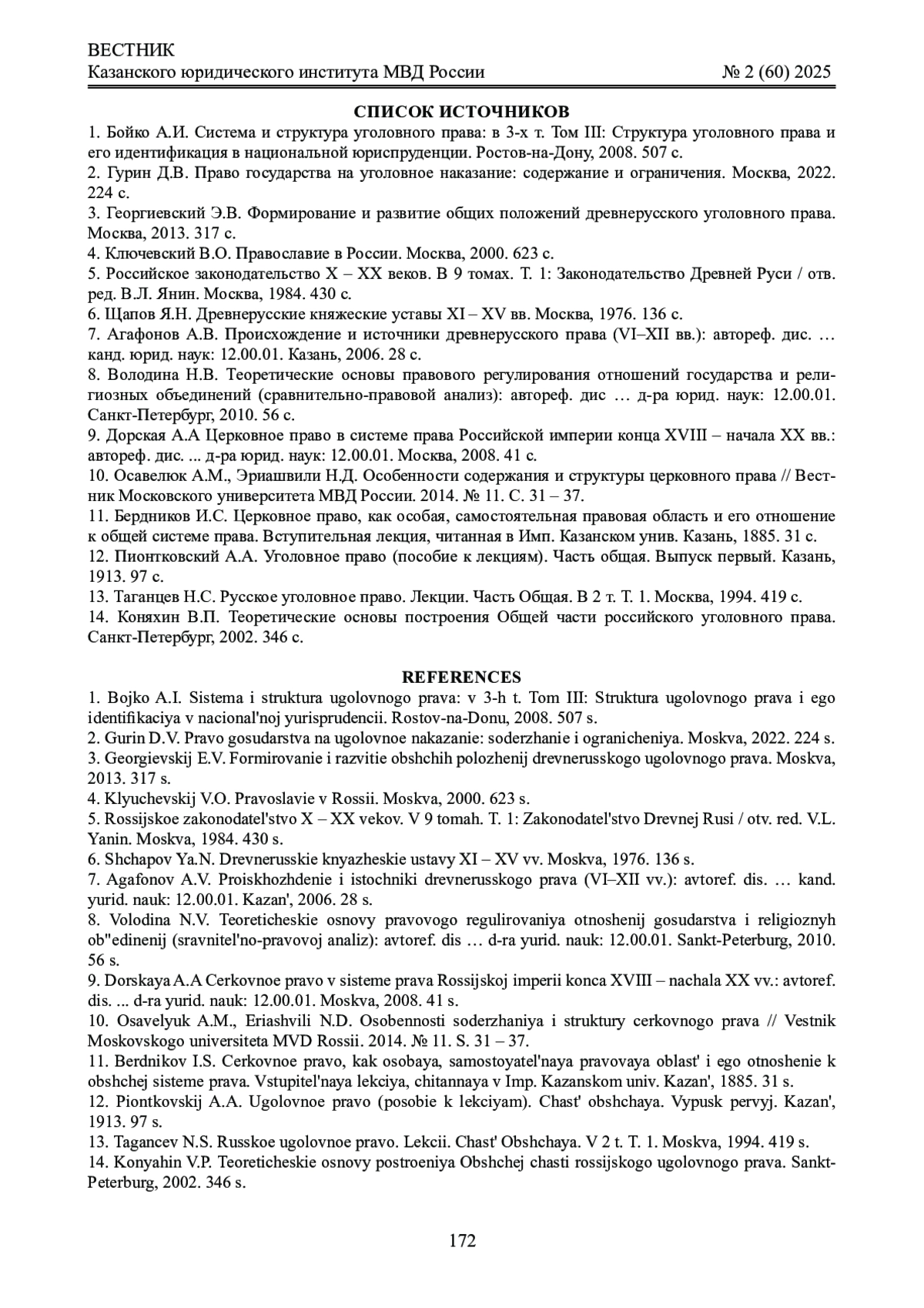 3. 	Георгиевский Э.В. Формирование и развитие общих положений древнерусского уголовного права. Москва, 2013. 317 с. EDN: RUUMZZ