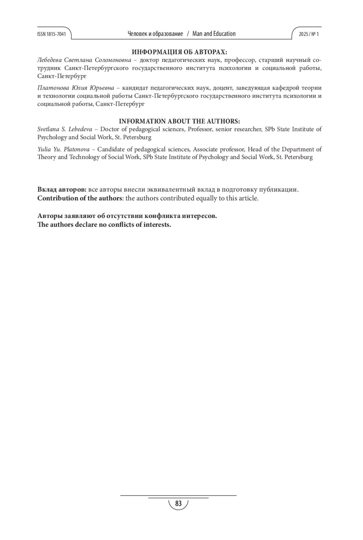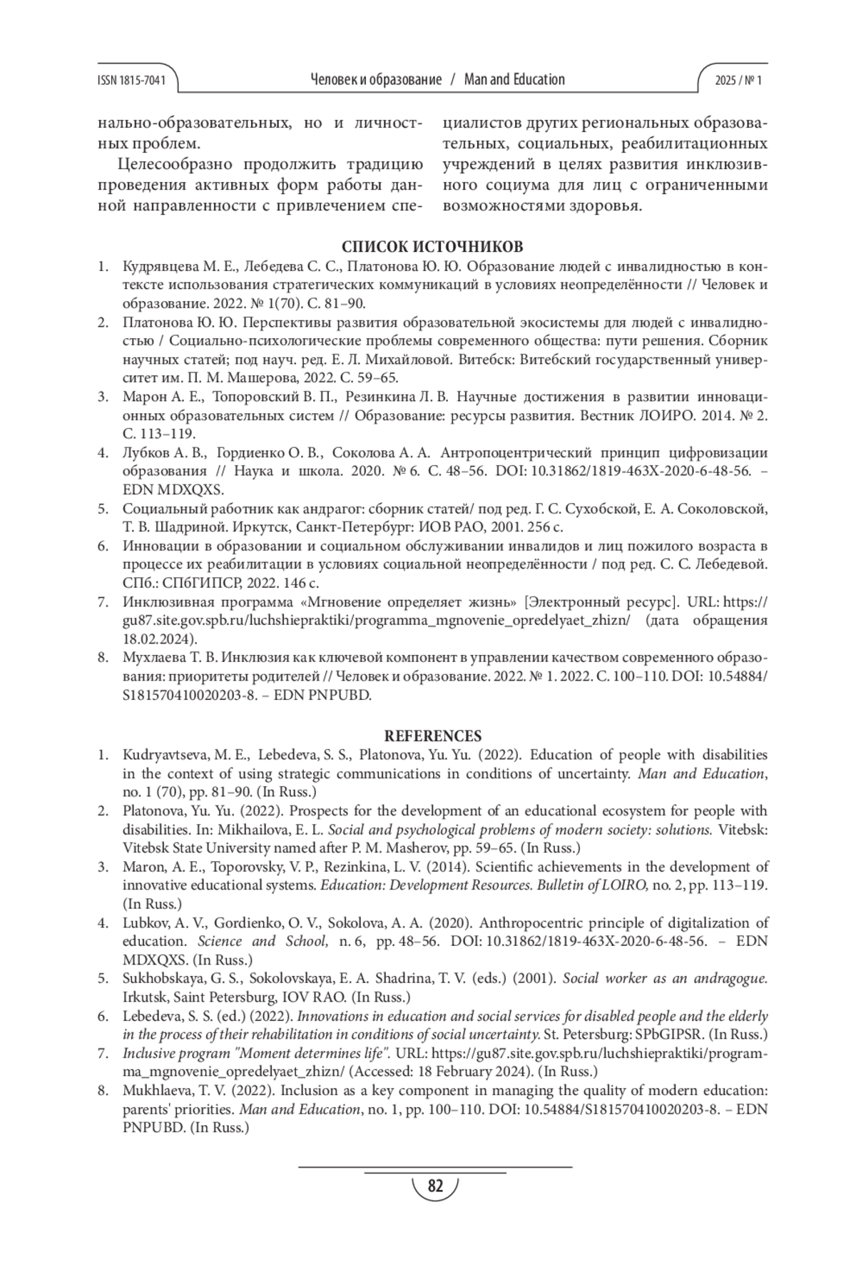 1. Кудрявцева М. Е., Лебедева С. С., Платонова Ю. Ю. Образование людей с инвалидностью в контексте использования стратегических коммуникаций в условиях неопределённости // Человек и образование. 2022. № 1(70). C. 81-90.