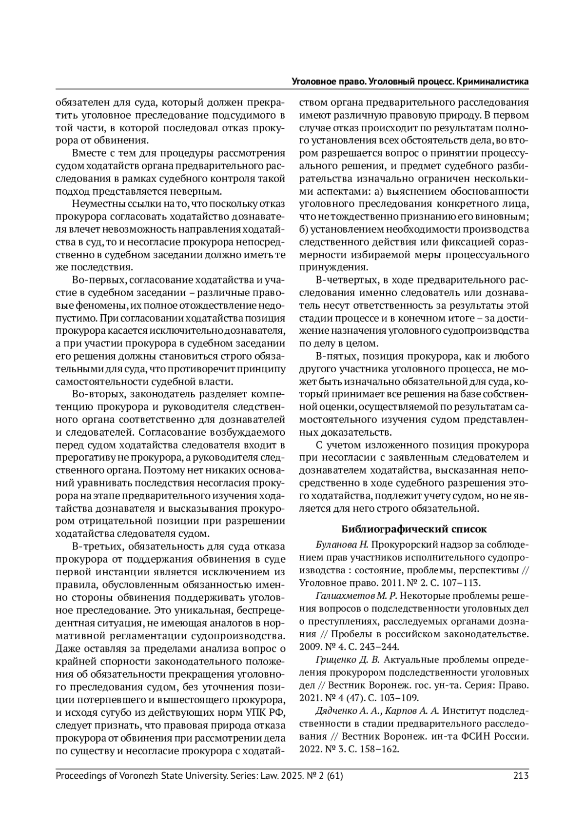 1. 	Буланова Н. Прокурорский надзор за соблюдением прав участников исполнительного судопроизводства: состояние, проблемы, перспективы // Уголовное право. 2011. № 2. С. 107-113. EDN: NEDSTR