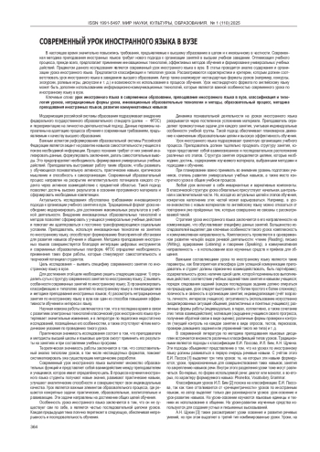 В настоящее время значительно повысились требования, предъявляемые к высшему образованию в целом и к иноязычному в частности. Современная методика преподавания иностранных языков требует нового подхода к организации занятий в высшем учебном заведении. Оптимизация учебного процесса, прежде всего, предполагает применение инновационных технологий, эффективных методов обучения и формирование универсальных учебных действий. Предметом данного исследования является современный урок иностранного языка в вузе. В статье проводится анализ содержания и организации урока иностранного языка. Предлагается классификация и типология уроков. Рассматриваются характеристики и критерии, которым должен соответствовать урок иностранного языка в заведениях высшего образования. Автор также анализирует нестандартные форматы уроков (например, конкурсы, экскурсии, ролевые игры, дискуссии и т. д.) и возможности их использования в процессе обучения. Урок нестандартного формата по английскому языку может быть дополнен использованием информационно-коммуникационных технологий, которые являются важной особенностью современного урока по иностранному языку в вузе.