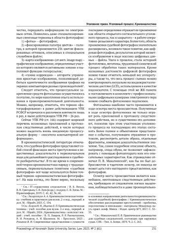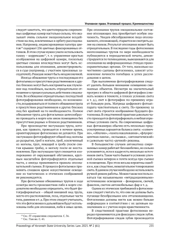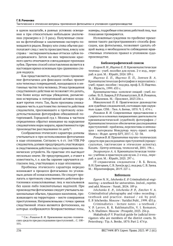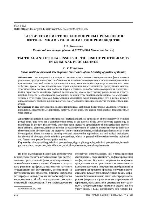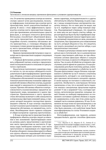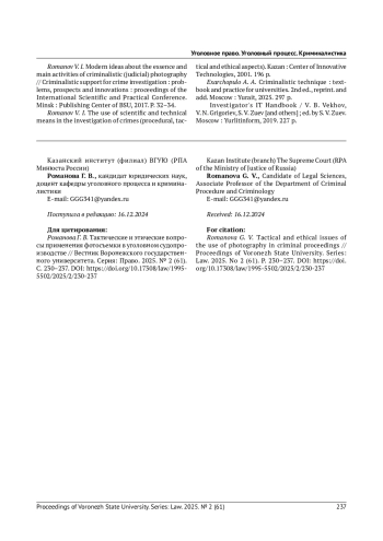 5. 	Романов В. И. Современные представления о сущности и основных направлениях деятельности криминалистической (судебной) фотографии // Криминалистическое обеспечение расследования преступлений: проблемы, перспективы и инновации: материалы Междунар. науч.-практ. конф. Минск: Издат. центр БГУ, 2017. С. 32-34. EDN: URVEJT