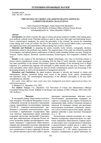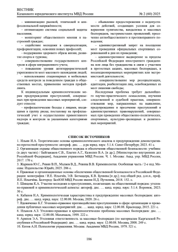 6. 	Кабанов Н.А. Криминологическая характеристика и предупреждение массовых беспорядков: автореф. дис. … канд. юрид. наук: 12.00.08. Москва, 2020. 26 с. EDN: GOEGUQ