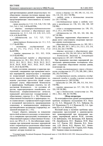 5. 	Шевцова К.А. Участие молодежи в преступлениях, посягающих на общественный порядок: уголовно-правовой и криминологический аспекты: автореф. дис. … канд. юрид. наук: 5.1.4. Воронеж, 2023. 30 с. EDN: XZWRTY