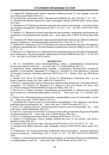 15. 	Мейтин А.А. Криминологическая характеристика преступлений, совершаемых футбольными болельщиками, и их предупреждение: автореф. дис. … канд. юрид. наук: 12.00.08. Ростов-на-Дону, 2004. 28 с. EDN: NHPAZJ