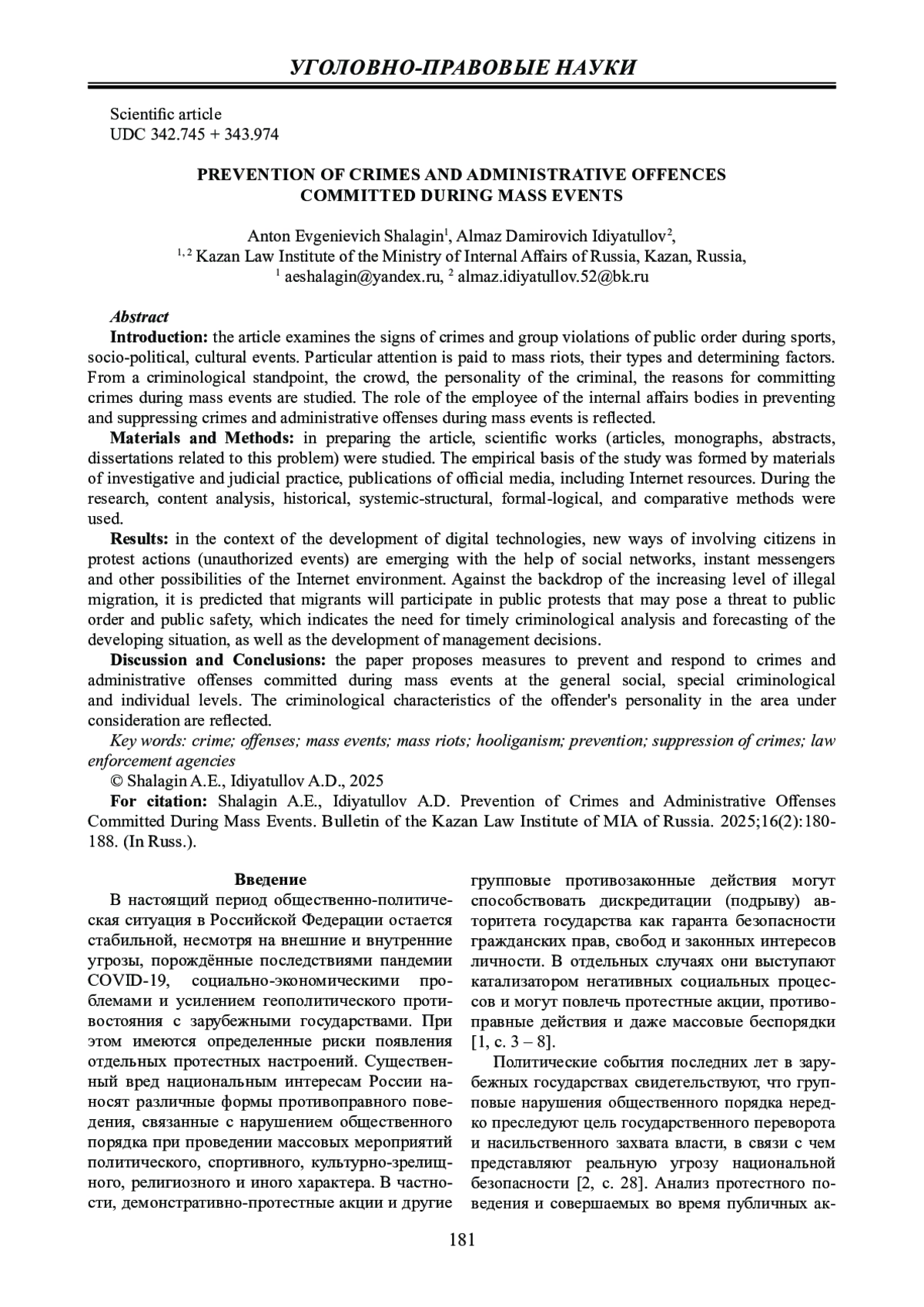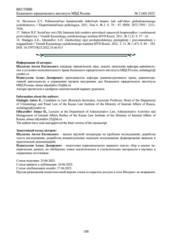 18. 	Шалагин А.Е., Идиятуллов А.Д. Зарубежный опыт предупреждения преступлений и правонарушений в мегаполисах // Вестник Казанского юридического института МВД России. 2022. Т. 13. № 1 (47). С. 94 - 103. DOI: 10.37973/KUI.2022.55.46.013 EDN: BRGKLE
