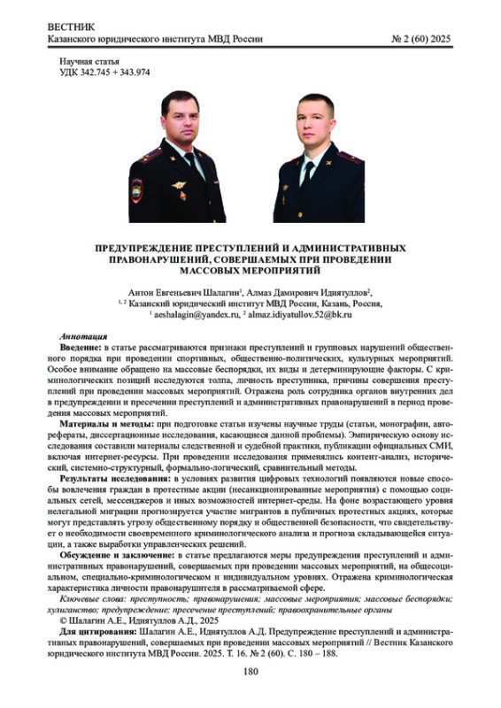 Обсуждение и заключение: в статье предлагаются меры предупреждения преступлений и административных правонарушений, совершаемых при проведении массовых мероприятий, на общесоциальном, специально-криминологическом и индивидуальном уровнях. Отражена криминологическая характеристика личности правонарушителя в рассматриваемой сфере.