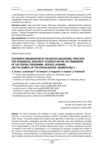 В статье рассматриваются проблемы использования особого педагогического подхода «Обучение служением» в процессе подготовки специалистов, участвующих в оказании комплексной помощи гражданам старших возрастных групп. Анализируются условия и алгоритмы взаимодействия научного и профессионального сообщества, педагогического вуза с органами государственной власти и учреждениями социальной сферы, оказывающими услуги пожилым гражданам, в процессе проведения добровольческих образовательных практик студентов. Предлагается реализация в Санкт-Петербурге Пилотного социально-ориентированного общественного проекта организации добровольческих образовательных практик студентов по профилю «Геронтология». Это предполагает создание «Центра развития профессиональных компетенций студентов-добровольцев по профилю «Геронтология», разработку мультидисциплинарного учебного курса дополнительного профессионального обучения студентов, проведение обучения и сертификации тестовых групп, выпуск комплекса методических материалов модульного учебного курса для согласованного перечня направлений специализаций обучающихся и персонала учреждений социальной сферы, взаимодействующих с добровольцами в ходе проведения образовательных практик.