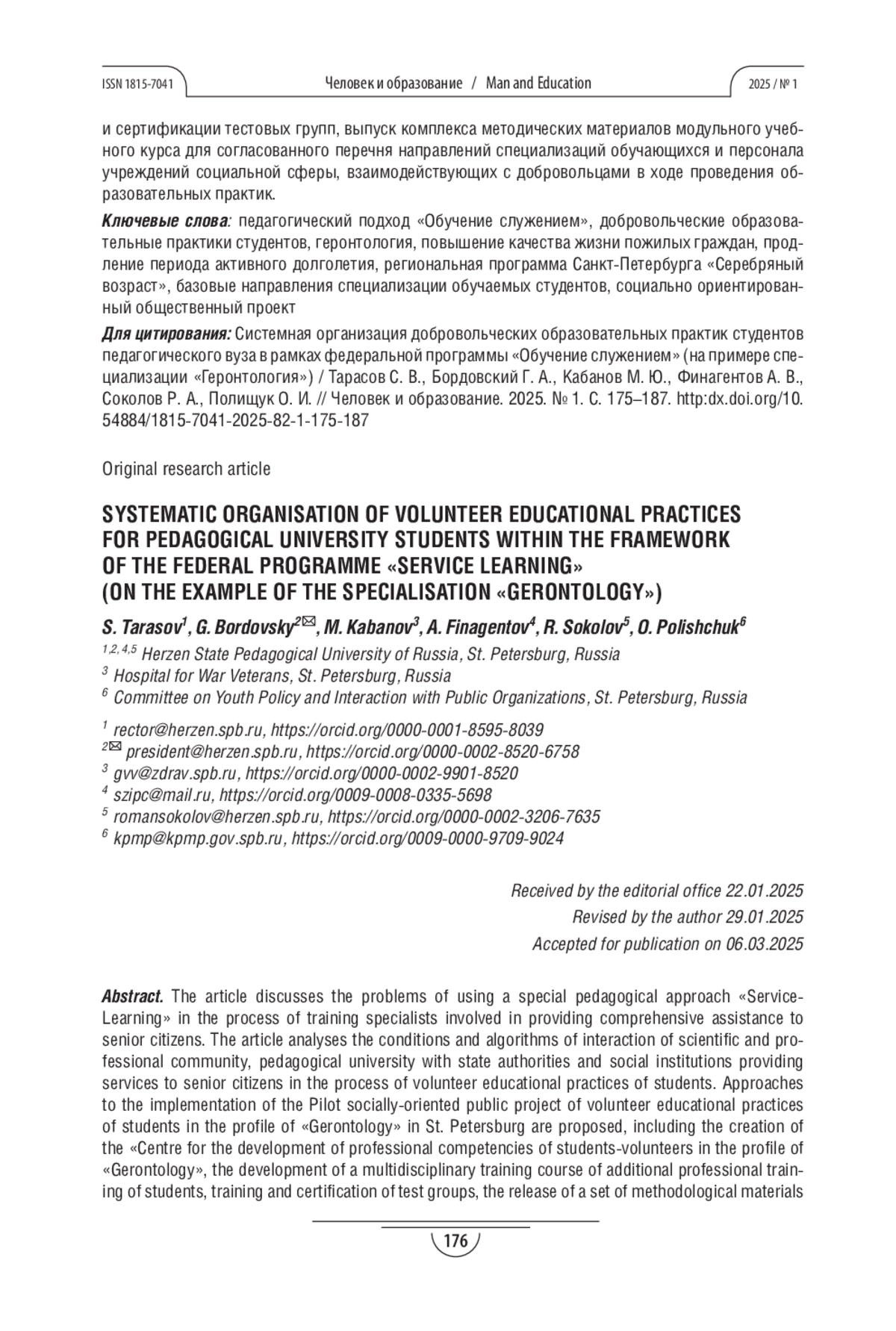 14. Тарасов С. В., Эргашев О. Н., Бордовский Г. А., Финагентов А. В. Концепция создания и развития региональной межведомственной системы информационно-образовательной поддержки пожилых граждан // Человек и образование. 2023. № 1. С. 9-23.