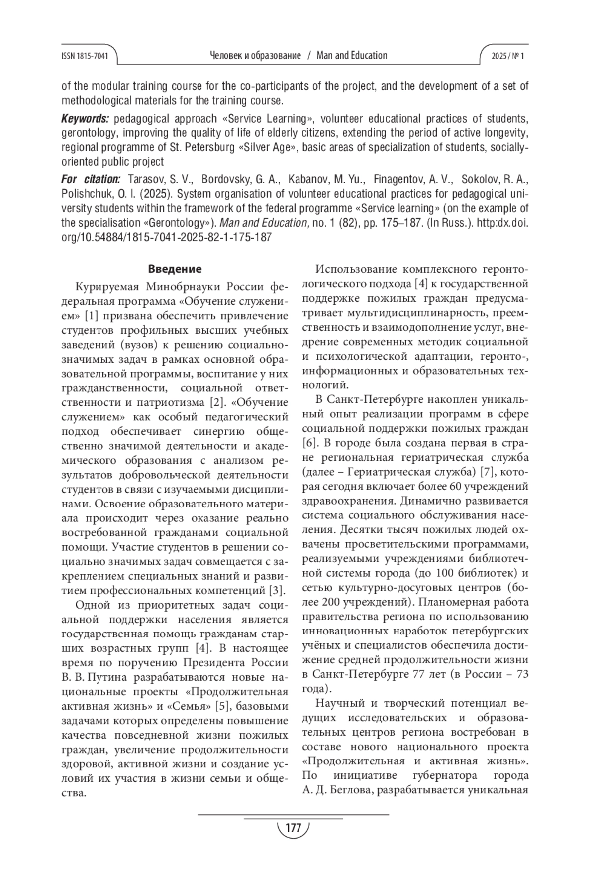 13. Тарасов С. В., Эргашев О. Н., Бордовский Г. А., Финагентов А. В. Стратегии образовательной поддержки в оказании комплексной помощи пожилым гражданам обоснование // Человек и образование. 2022. № 3. С. 185-196.