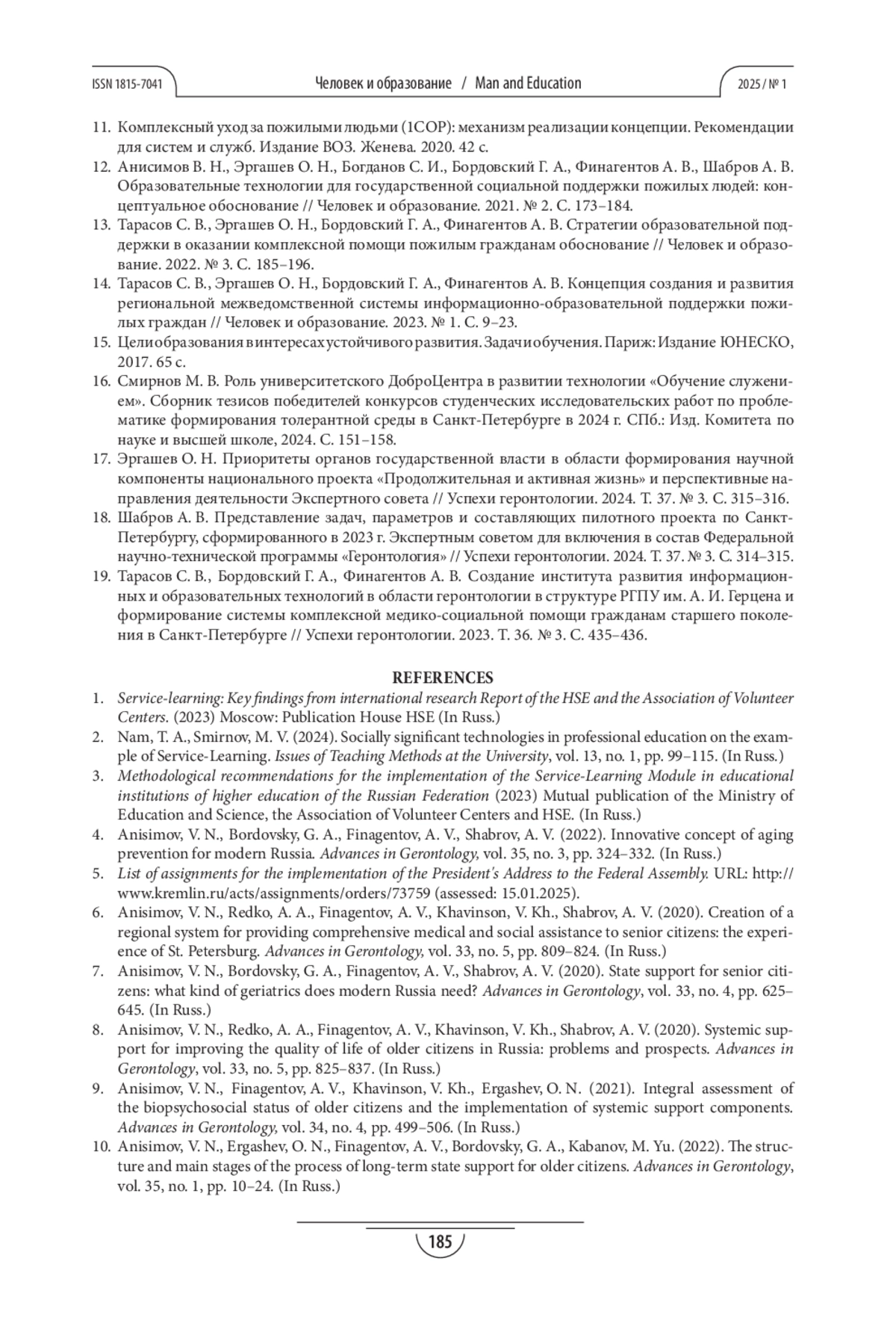 8. Анисимов В. Н., Редько А. А., Финагентов А. В., Хавинсон В. Х., Шабров А. В. Системная поддержка повышения качества жизни граждан старшего поколения в России: проблемы и перспективы // Успехи геронтологии. 2020. Т. ЗЗ. № 5. С. 825-837.