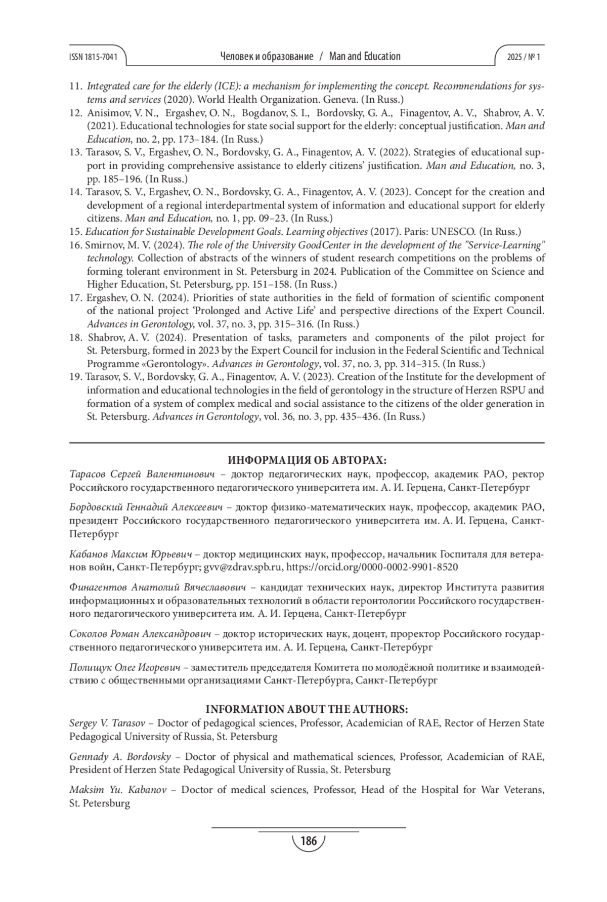 19. Тарасов С. В., Бордовский Г. А., Финагентов А. В. Создание института развития информационных и образовательных технологий в области геронтологии в структуре РГПУ им. А. И. Герцена и формирование системы комплексной медико-социальной помощи гражданам старшего поколения в Санкт-Петербурге // Успехи геронтологии. 2023. Т. 36. № 3. С. 435-436.