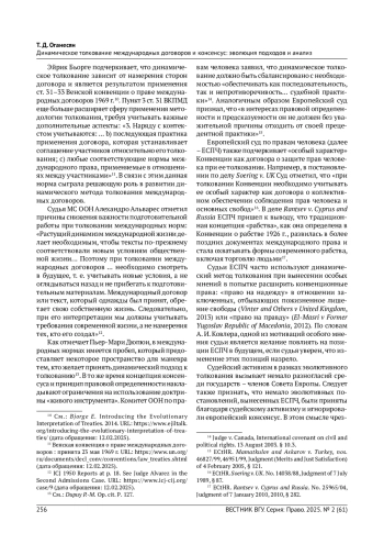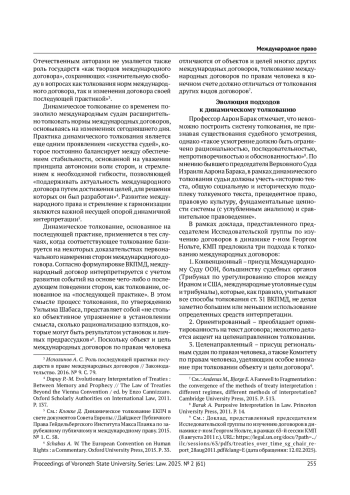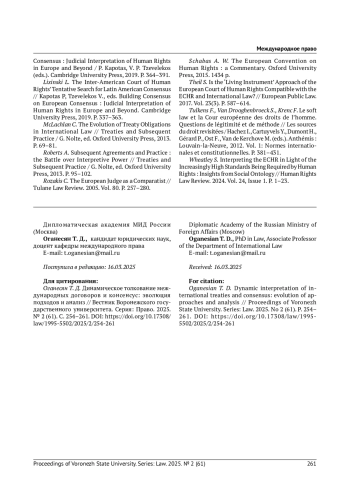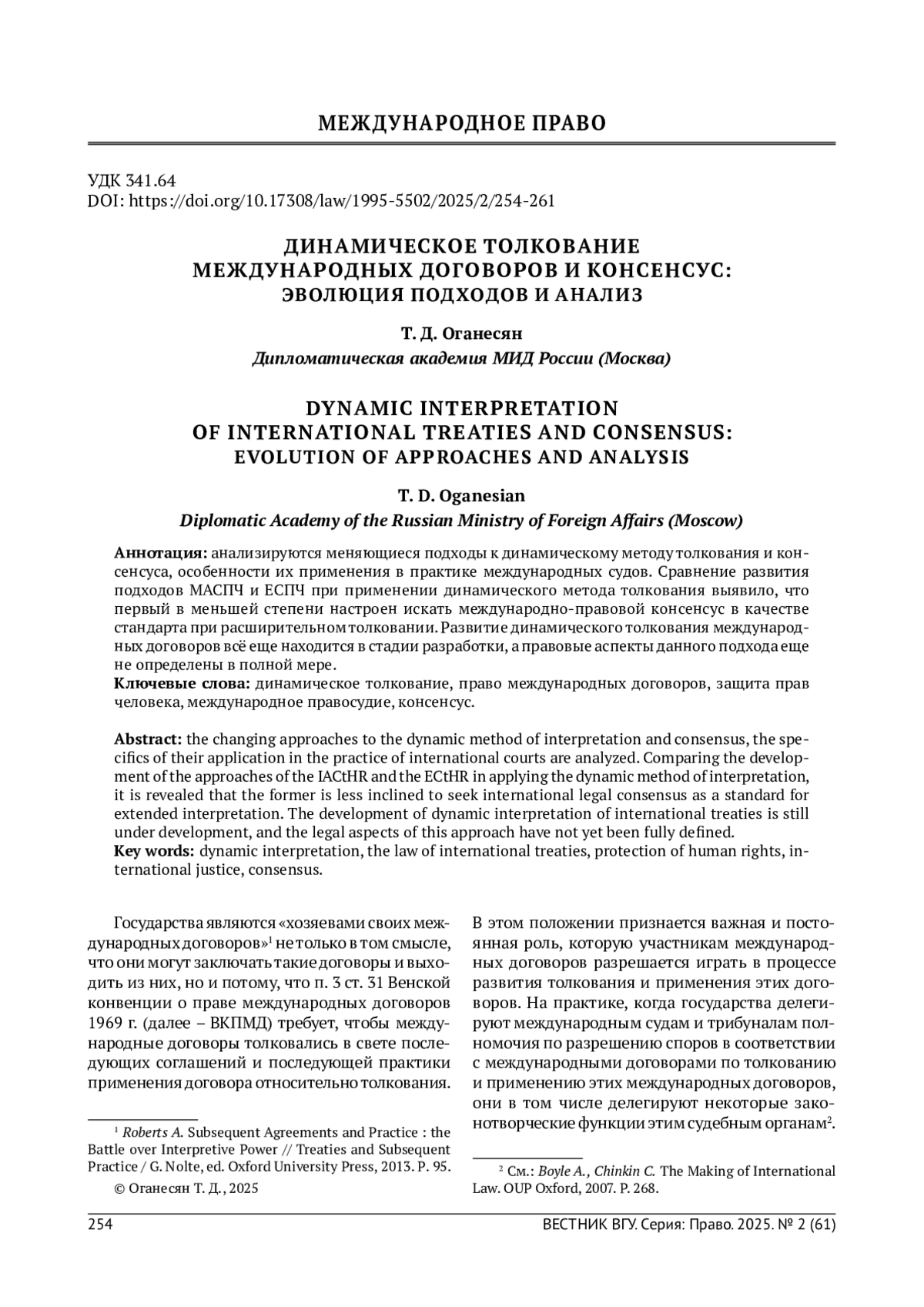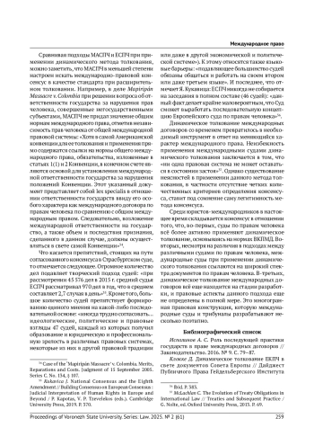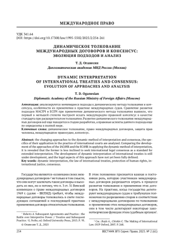 Анализируются меняющиеся подходы к динамическому методу толкования и консенсуса, особенности их применения в практике международных судов. Сравнение развития подходов МАСПЧ и ЕСПЧ при применении динамического метода толкования выявило, что первый в меньшей степени настроен искать международно-правовой консенсус в качестве стандарта при расширительном толковании. Развитие динамического толкования международных договоров всё еще находится в стадии разработки, а правовые аспекты данного подхода еще не определены в полной мере.