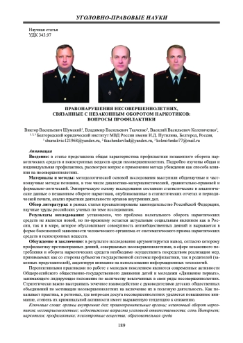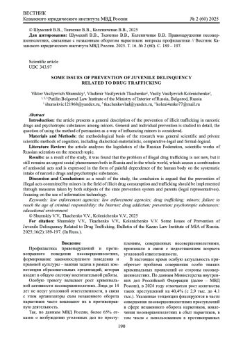7. 	Радькова Л.С. О некоторых мерах по профилактике вовлечения несовершеннолетних в незаконный оборот наркотических средств, психотропных веществ или их аналогов // Вестник Воронежского института МВД России. 2018. № 4. С. 248 - 253. EDN: YQXMNF