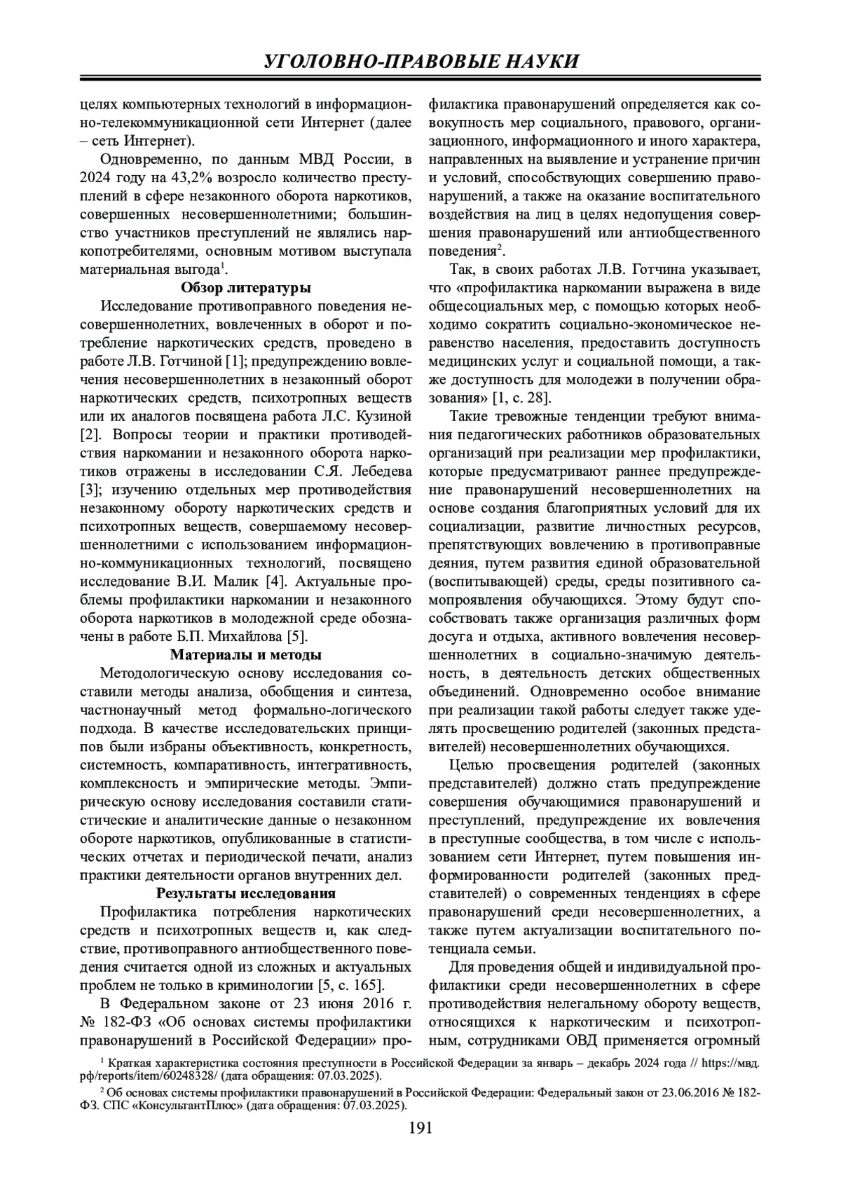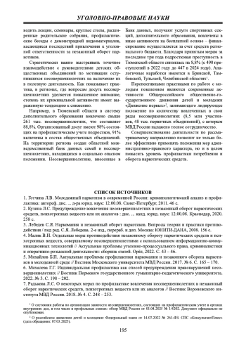 1. 	Готчина Л.В. Молодежный наркотизм в современной России: криминологический анализ и профилактика: автореф. дис.... д-ра юрид. наук: 12.00.08. Санкт-Петербург, 2011. 46 с. EDN: ZOHUWL