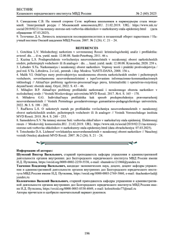 4. 	Малик В.И. Отдельные меры противодействия незаконному обороту наркотических средств и психотропных веществ, совершаемому несовершеннолетними с использованием информационно-коммуникационных технологий // Актуальные проблемы уголовно-процессуального права, криминалистики и оперативно-розыскной деятельности: сборник статей. Орёл, 2022. С. 43 - 46. EDN: PRLAPH