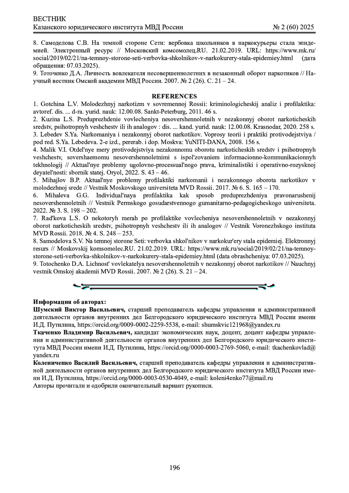 2. 	Кузина Л.С. Предупреждение вовлечения несовершеннолетних в незаконный оборот наркотических средств, психотропных веществ или их аналогов: дис.... канд. юрид. наук: 12.00.08. Краснодар, 2020. 258 с. EDN: BIWKYY