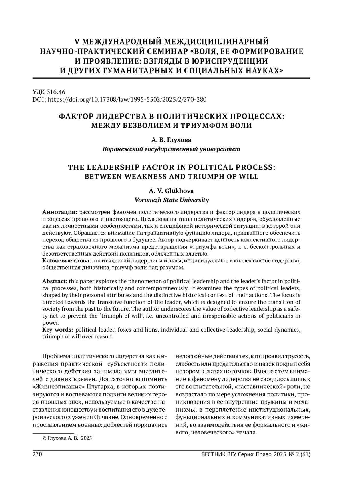 Рассмотрен феномен политического лидерства и фактор лидера в политических процессах прошлого и настоящего. Исследованы типы политических лидеров, обусловленные как их личностными особенностями, так и спецификой исторической ситуации, в которой они действуют. Обращается внимание на транзитивную функцию лидера, призванного обеспечить переход общества из прошлого в будущее. Автор подчеркивает ценность коллективного лидерства как страховочного механизма предотвращения «триумфа воли», т. е. бесконтрольных и безответственных действий политиков, облеченных властью.