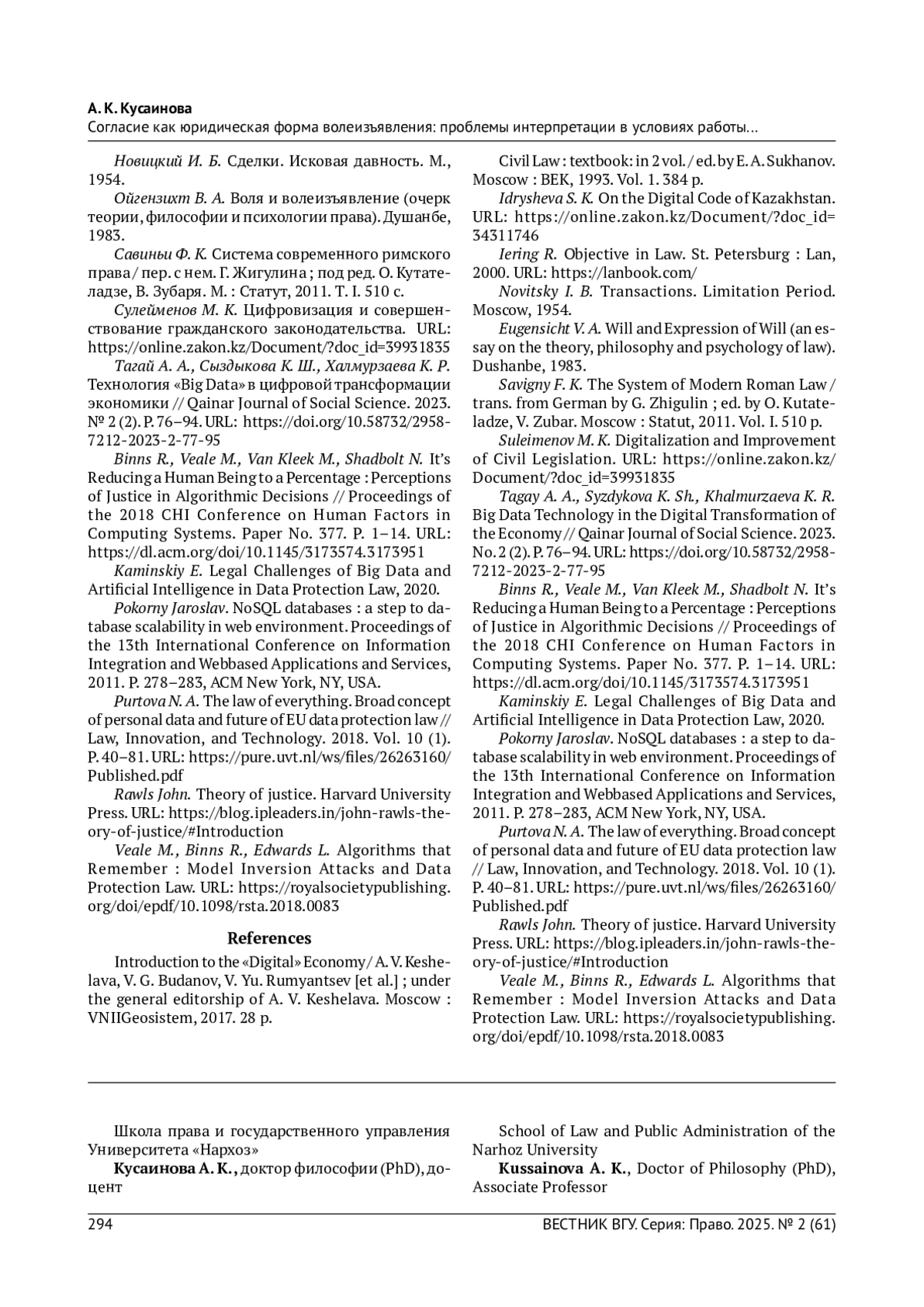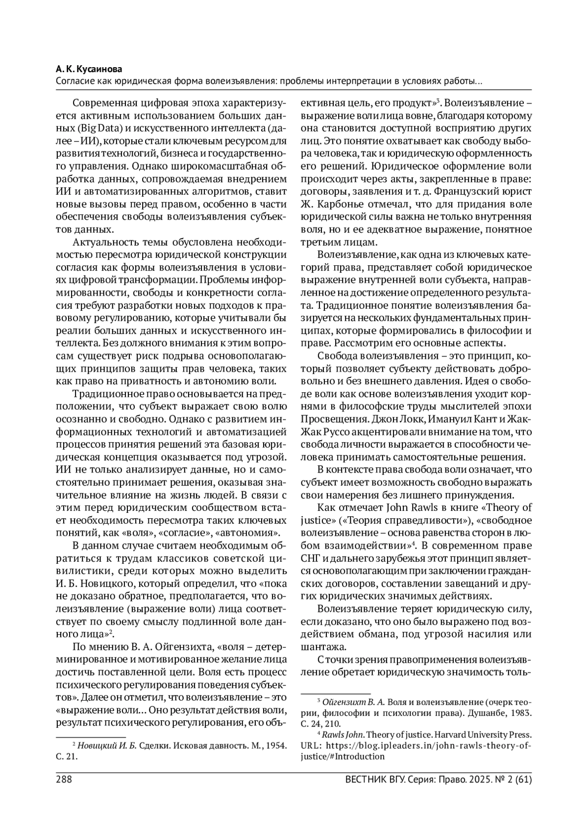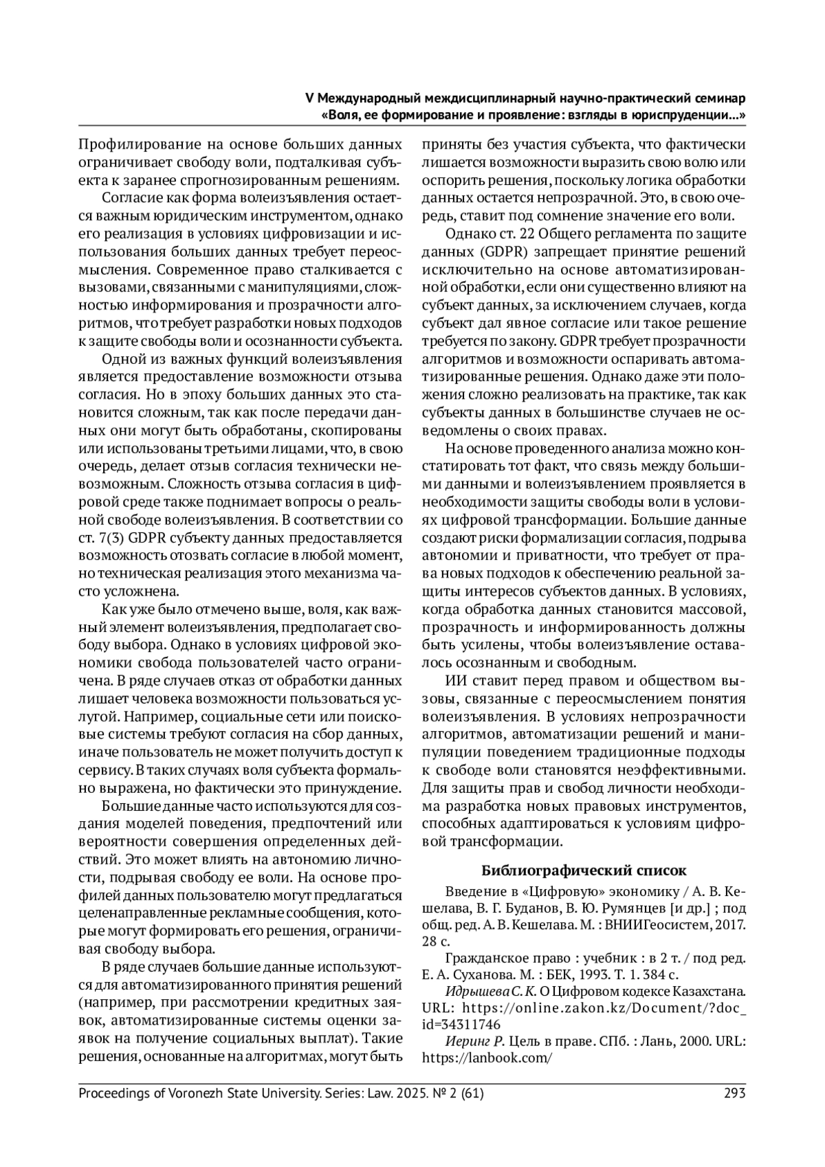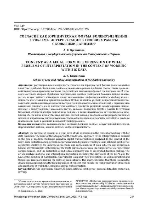 Рассматривается особенность согласия как юридической формы волеизъявления в контексте работы с большими данными; проанализирована проблема соответствия традиционного подхода к трактовке согласия современным вызовам цифровой трансформации. В условиях массового сбора и обработки персональных данных технологии больших данных и алгоритмы искусственного интеллекта ставят под сомнение информированность, свободу и осознанность волеизъявления субъектов данных. Особое внимание уделено вопросам многоцелевого использования данных, сложности восприятия пользовательских соглашений и ограничению автономии личности из-за автоматизированного принятия решений. Анализируются национальное и международное законодательство, включая положения GDPR и Закона Республики Казахстан «О персональных данных и их защите», а также практические и теоретические проблемы обеспечения прав субъектов данных. Сделан вывод о необходимости разработки новых подходов к правовому регулированию согласия, обеспечивающих реальное сохранение свободы и автономии воли в условиях цифровой трансформации.