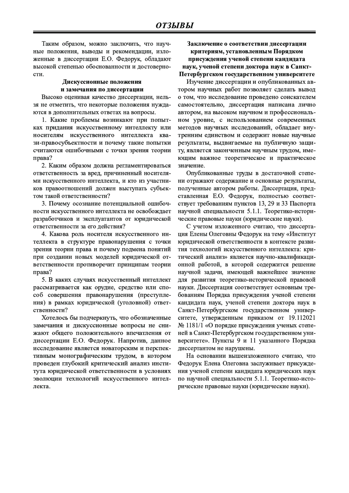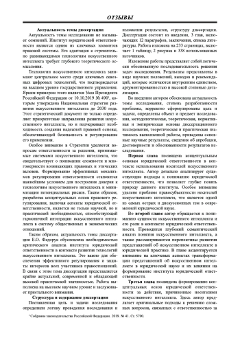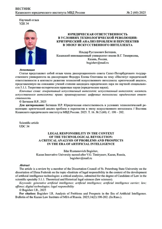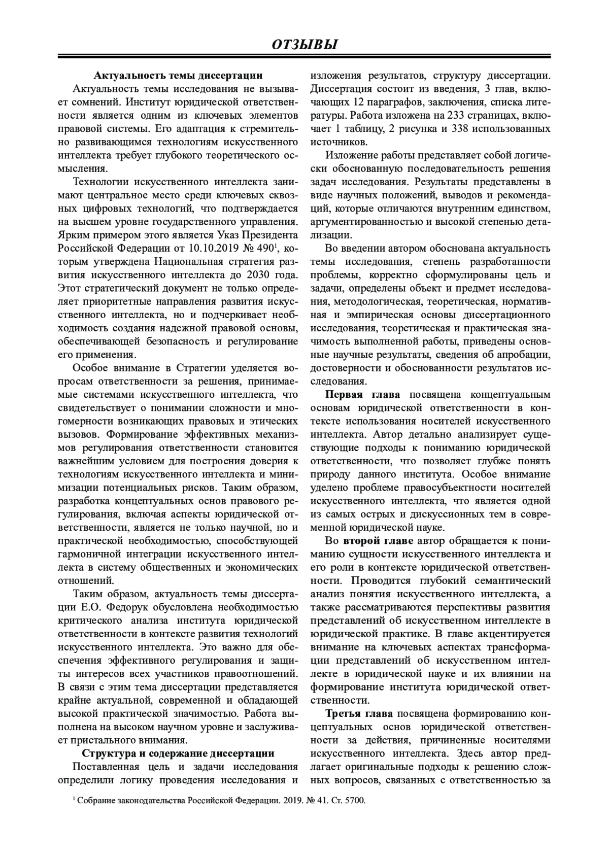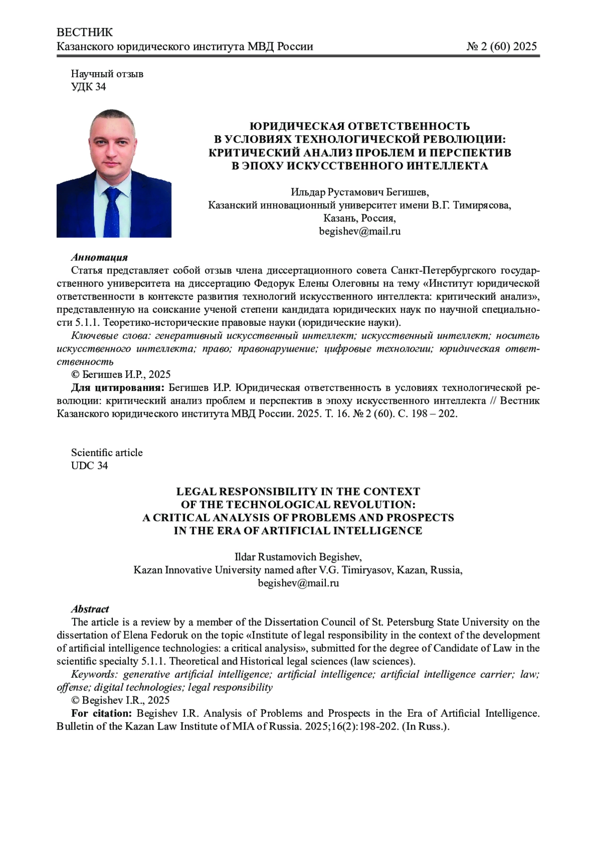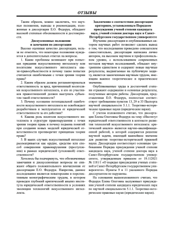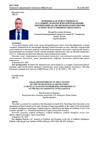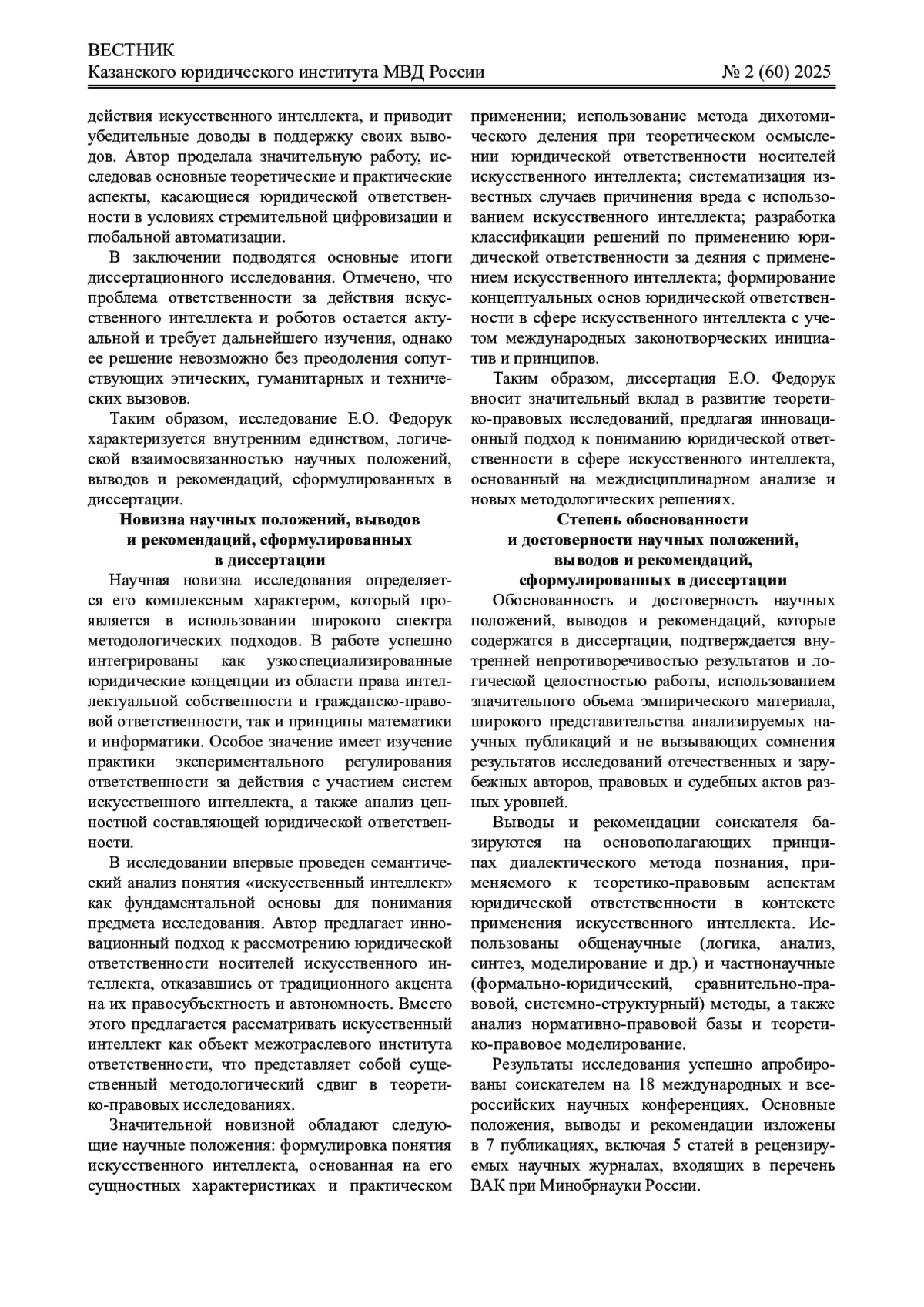 Статья представляет собой отзыв члена диссертационного совета Санкт-Петербургского государственного университета на диссертацию Федорук Елены Олеговны на тему «Институт юридической ответственности в контексте развития технологий искусственного интеллекта: критический анализ», представленную на соискание ученой степени кандидата юридических наук по научной специальности 5.1.1. Теоретико-исторические правовые науки (юридические науки).