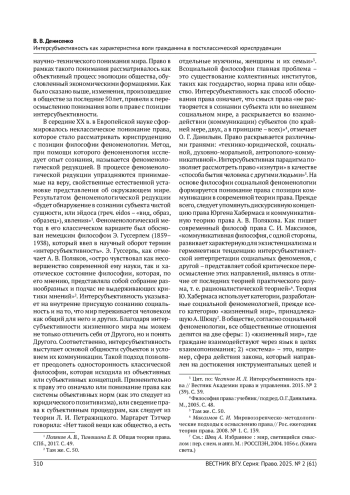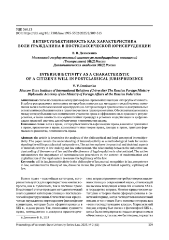 В работе раскрываются понимание интерсубъективности как методологической основы понимания воли в постклассической юриспруденции. Автор исследует практические и доктринальные аспекты интерсубъективности в правотворчестве и правоприменении. Обоснованы взаимосвязь между интерсубъективным пониманием сущности права и эффективностью правового регулирования, а также важность коммуникативных процедур в условиях модернизации и цифровизации правовой системы для обеспечения легитимности закона.