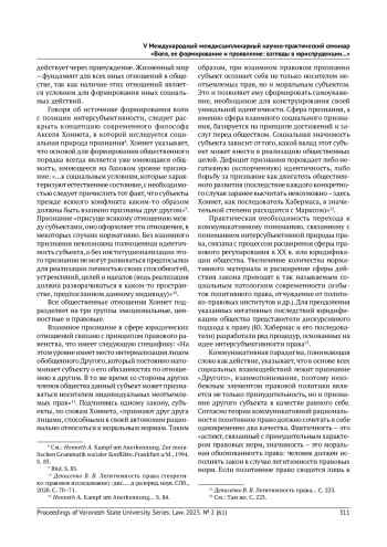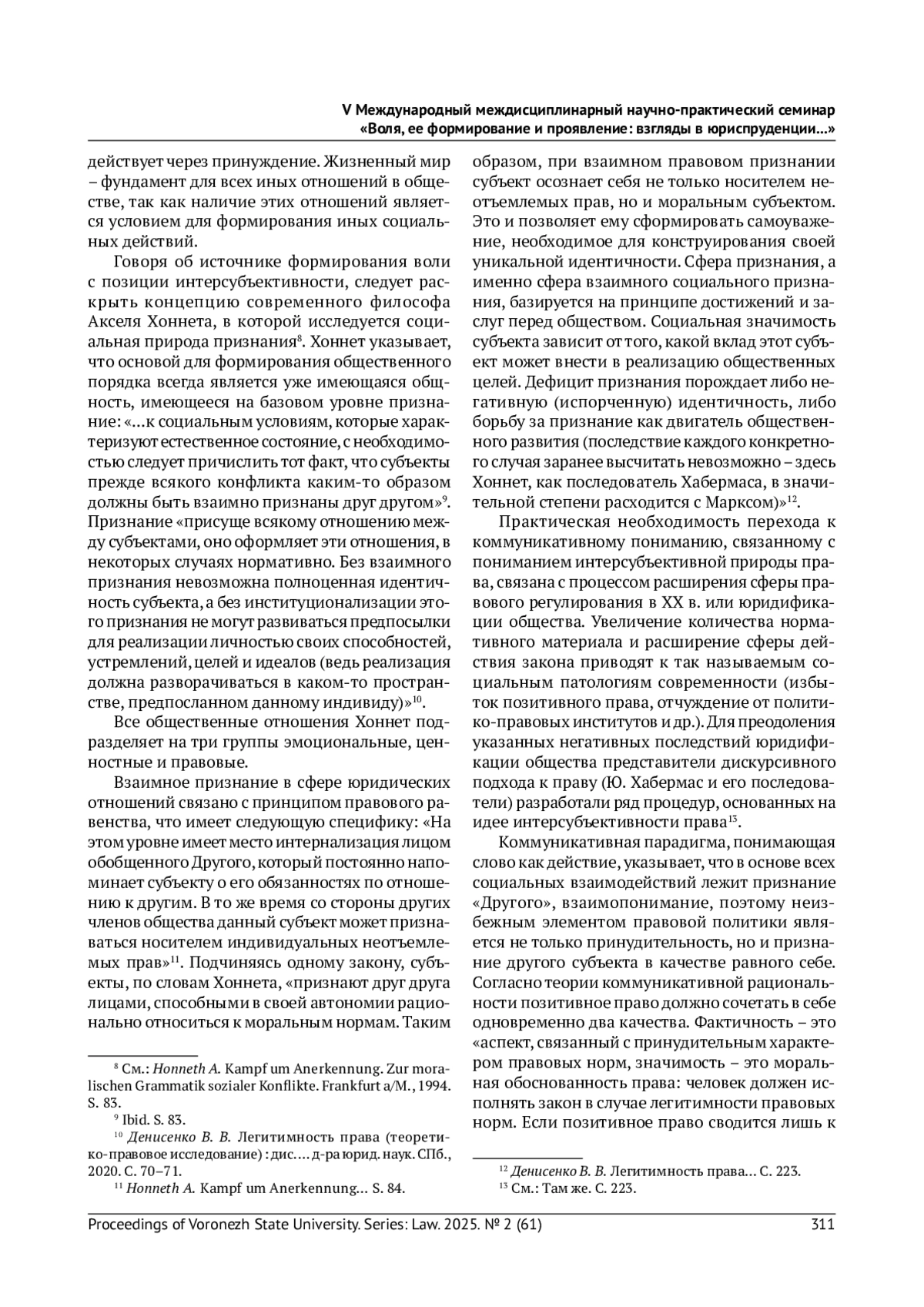 Говоря об источнике формирования воли с позиции интерсубъективности, следует раскрыть концепцию современного философа Акселя Хоннета, в которой исследуется социальная природа признания. Хоннет указывает, что основой для формирования общественного порядка всегда является уже имеющаяся общность, имеющееся на базовом уровне признание: «…к социальным условиям, которые характеризуют естественное состояние, с необходимостью следует причислить тот факт, что субъекты прежде всякого конфликта каким-то образом должны быть взаимно признаны друг другом»9. Признание «присуще всякому отношению между субъектами, оно оформляет эти отношения, в некоторых случаях нормативно. Без взаимного признания невозможна полноценная идентичность субъекта, а без институционализации этого признания не могут развиваться предпосылки для реализации личностью своих способностей, устремлений, целей и идеалов (ведь реализация должна разворачиваться в каком-то пространстве, предпосланном данному индивиду)»10. Все общественные отношения Хоннет подразделяет на три группы эмоциональные, ценностные и правовые.