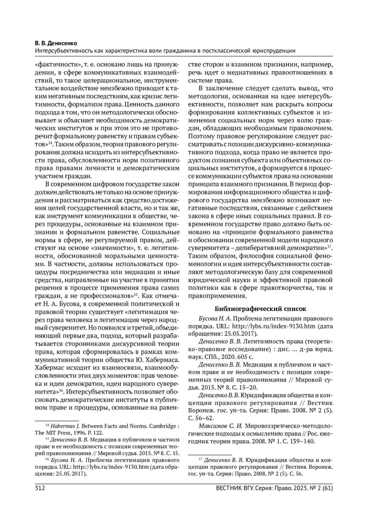 4. 	Денисенко В. В. Юридификация общества и концепции правового регулирования // Вестник Воронеж. гос. ун-та. Серия: Право. 2008. № 2 (5). С. 56-62.
