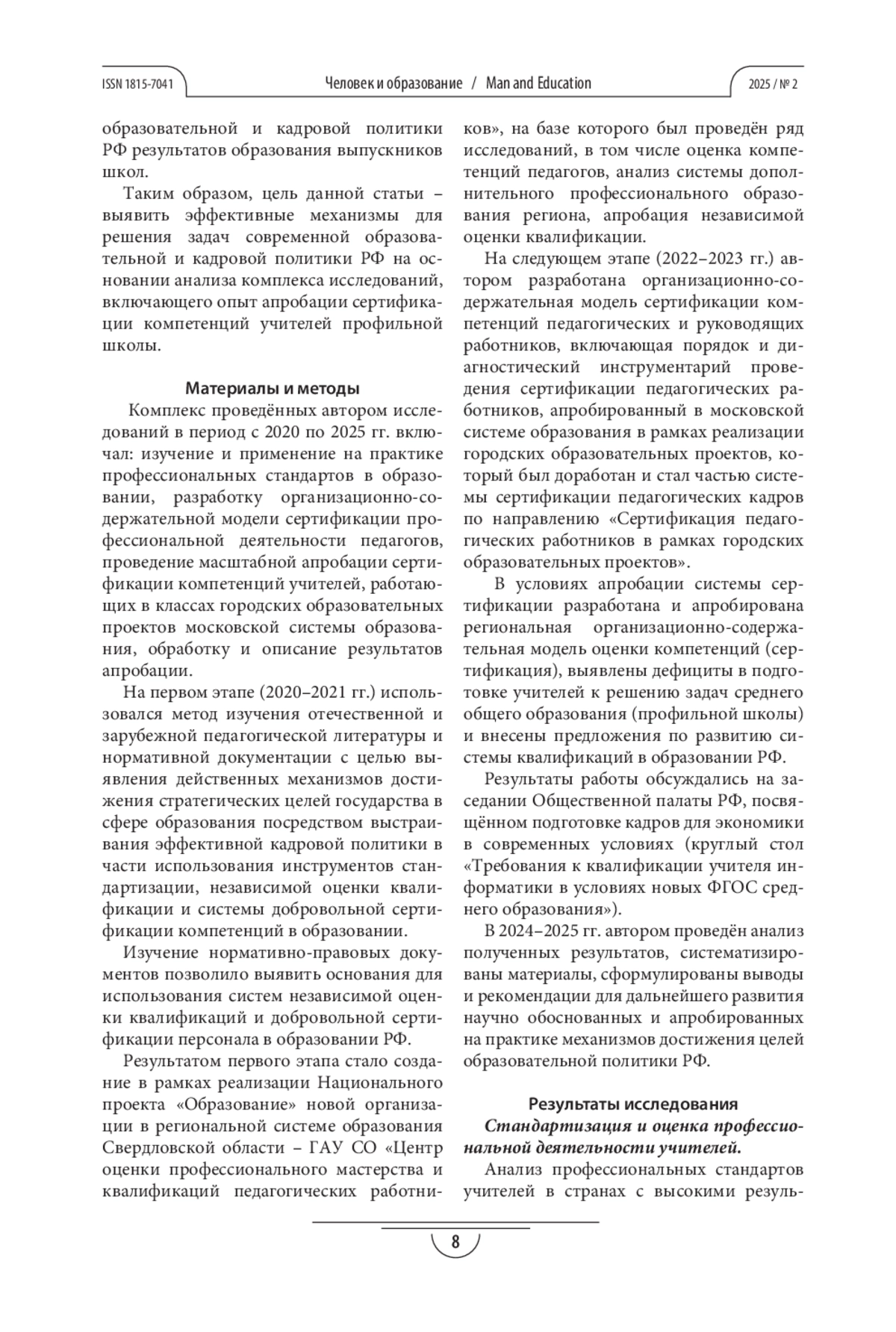На первом этапе (2020–2021 гг.) использовался метод изучения отечественной и зарубежной педагогической литературы и нормативной документации с целью выявления действенных механизмов достижения стратегических целей государства в сфере образования посредством выстраивания эффективной кадровой политики в части использования инструментов стандартизации, независимой оценки квалификации и системы добровольной сертификации компетенций в образовании.