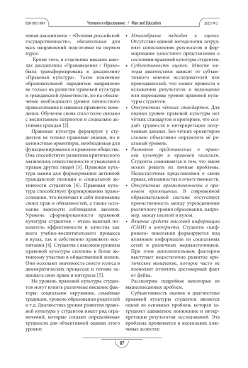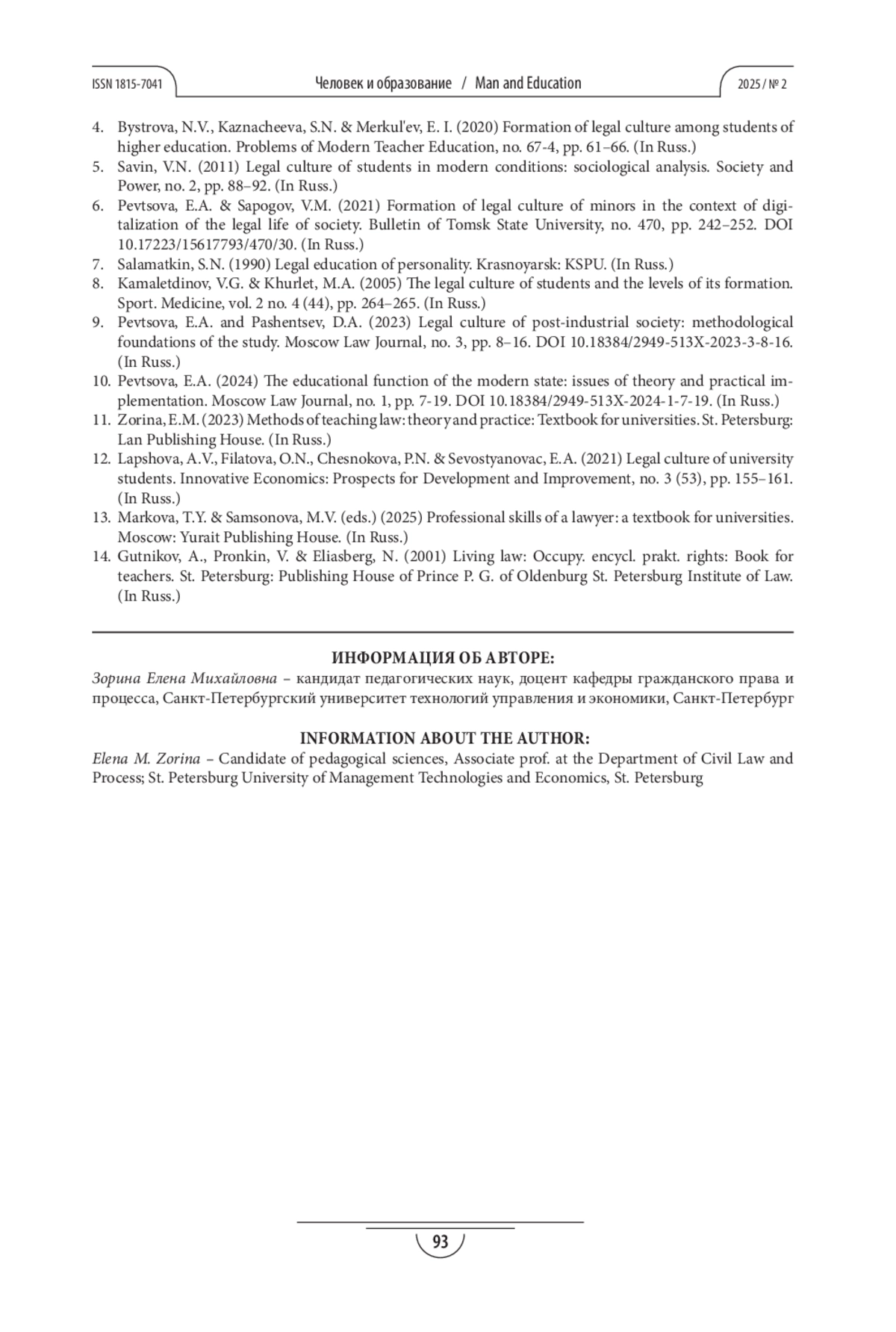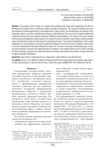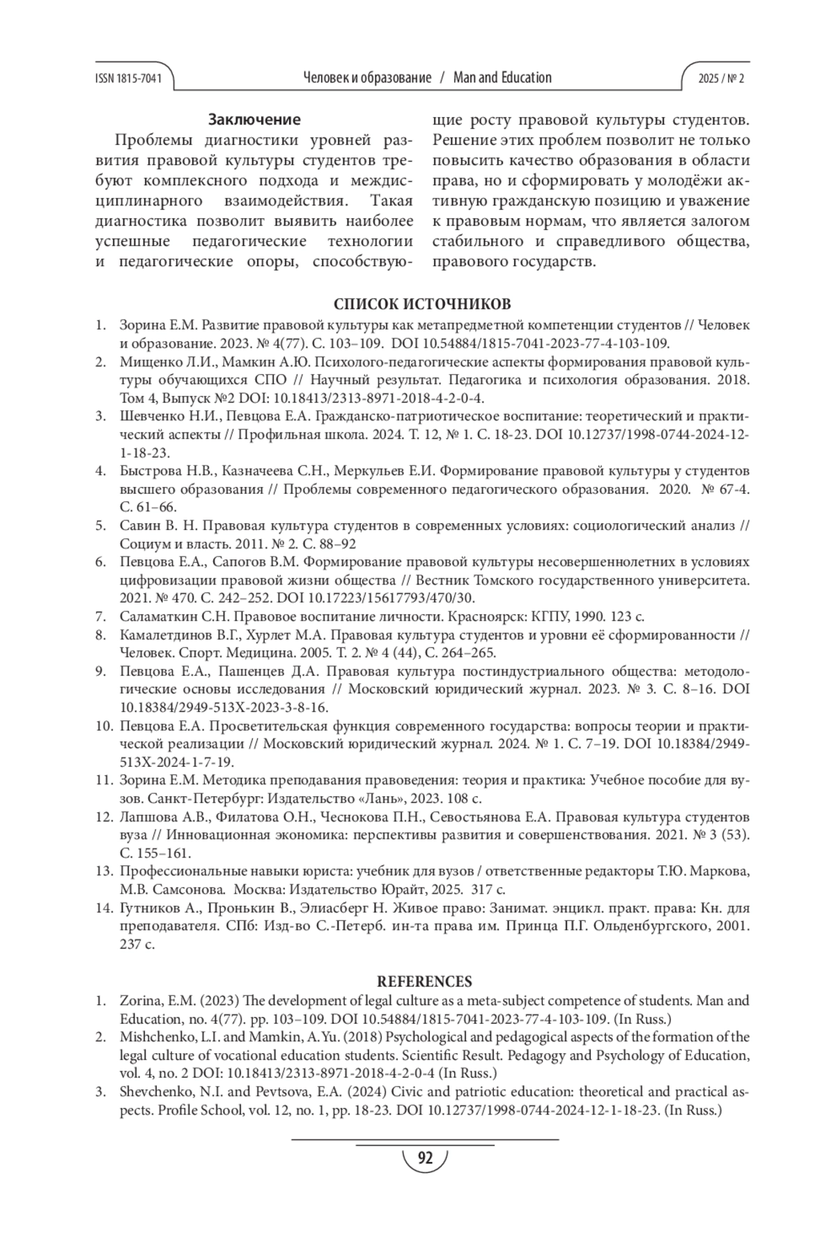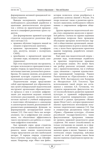 1. Зорина Е.М. Развитие правовой культуры как метапредметной компетенции студентов // Человек и образование. 2023. № 4(77). С. 103-109. https://doi.org/10.54884/1815-7041-2023-77-4-103-109.