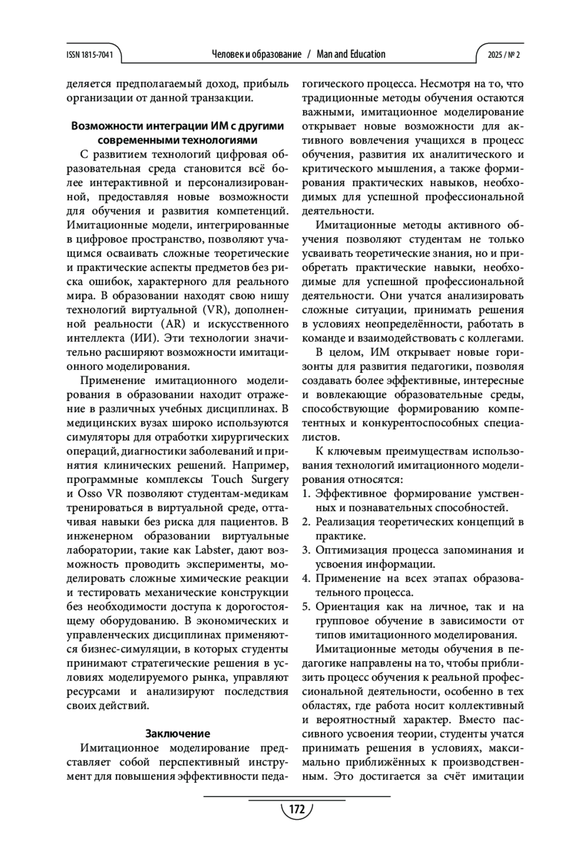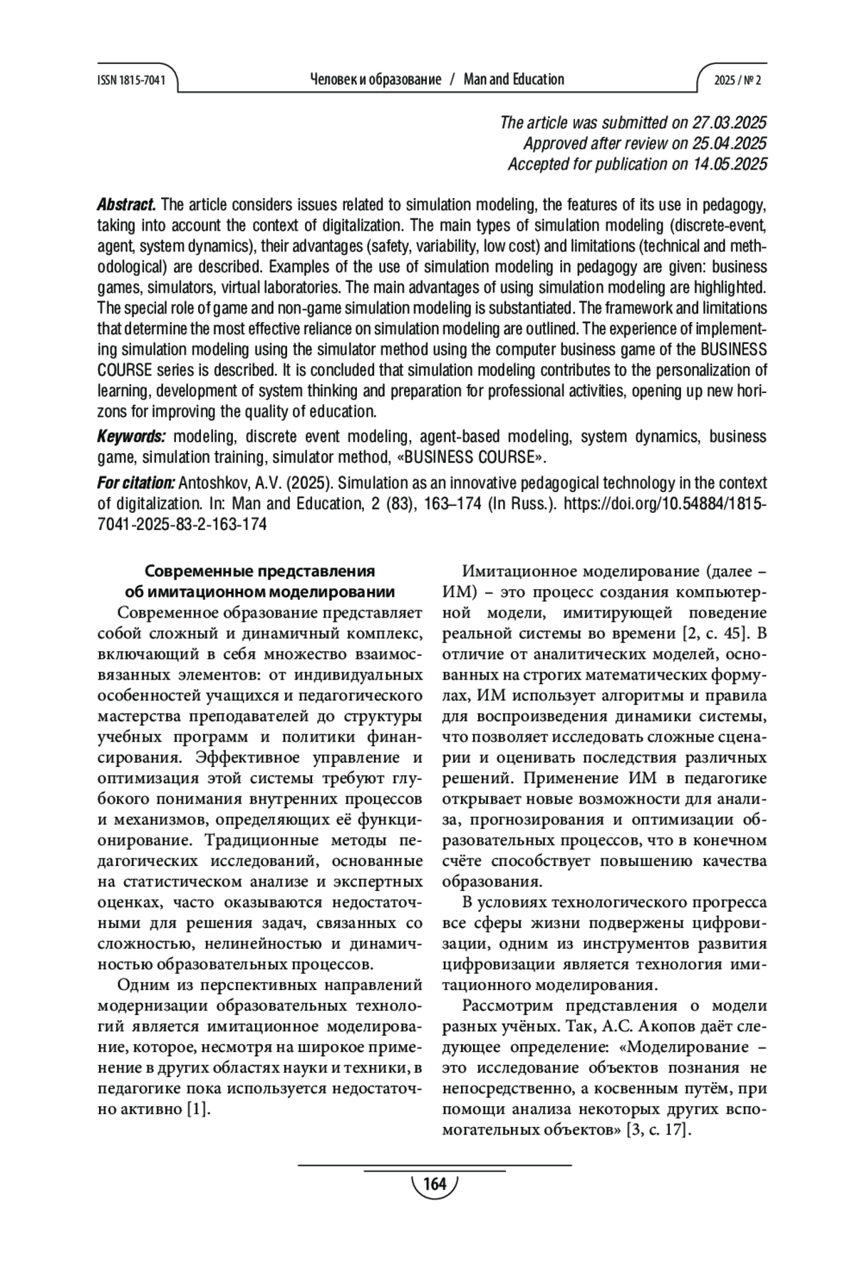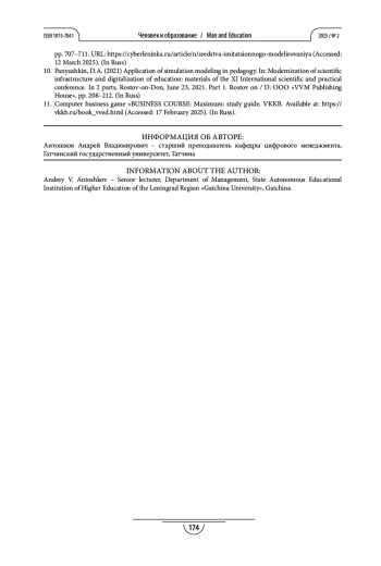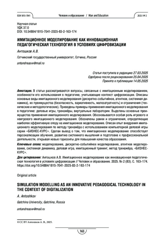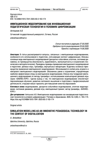 В статье рассматриваются вопросы, связанные с имитационным моделированием, особенности его использования в педагогике, учитывающие контекст цифровизации. Описаны основные виды имитационного моделирования (дискретно-событийное, агентное, системная динамика), их преимущества (безопасность, вариативность, малозатратность) и ограничения (технические и методологические). Приведены примеры применения имитационного моделирования в педагогике: деловые игры, тренажёры, виртуальные лаборатории. Выделены основные преимущества применения имитационного моделирования. Обосновывается особая роль игрового и неигрового имитационного моделирования. Обозначены рамки и ограничения, определяющие наиболее эффективную опору на имитационное моделирование. Описан опыт внедрения имитационного моделирования по методу тренажёра с использованием компьютерной деловой игры серии «БИЗНЕС-КУРС». Сделан вывод о том, что имитационное моделирование способствует персонализации обучения, развитию системного мышления и подготовке к профессиональной деятельности, открывая новые горизонты для повышения качества образования.