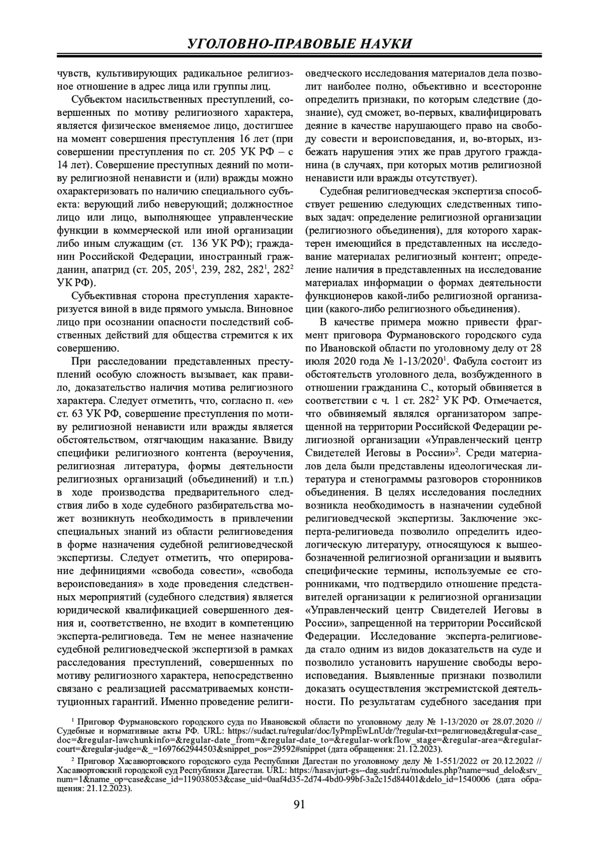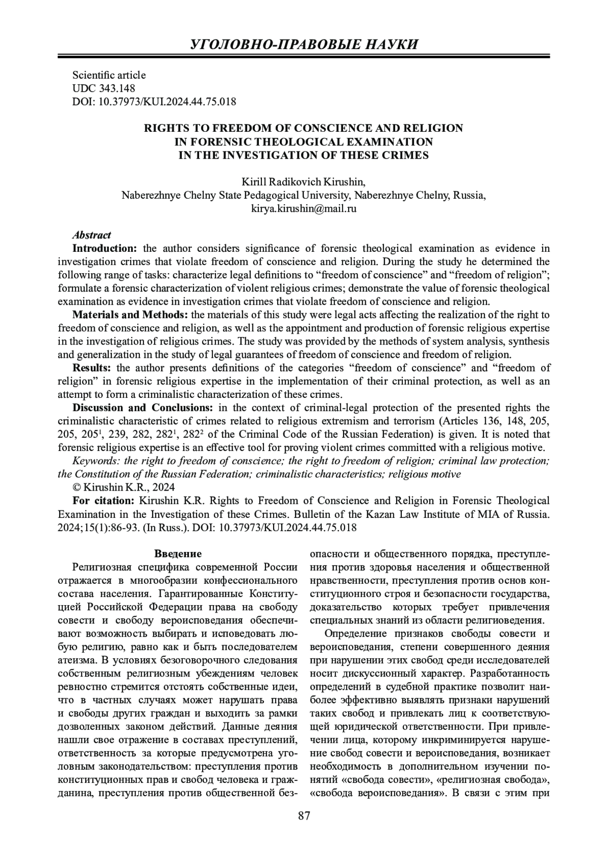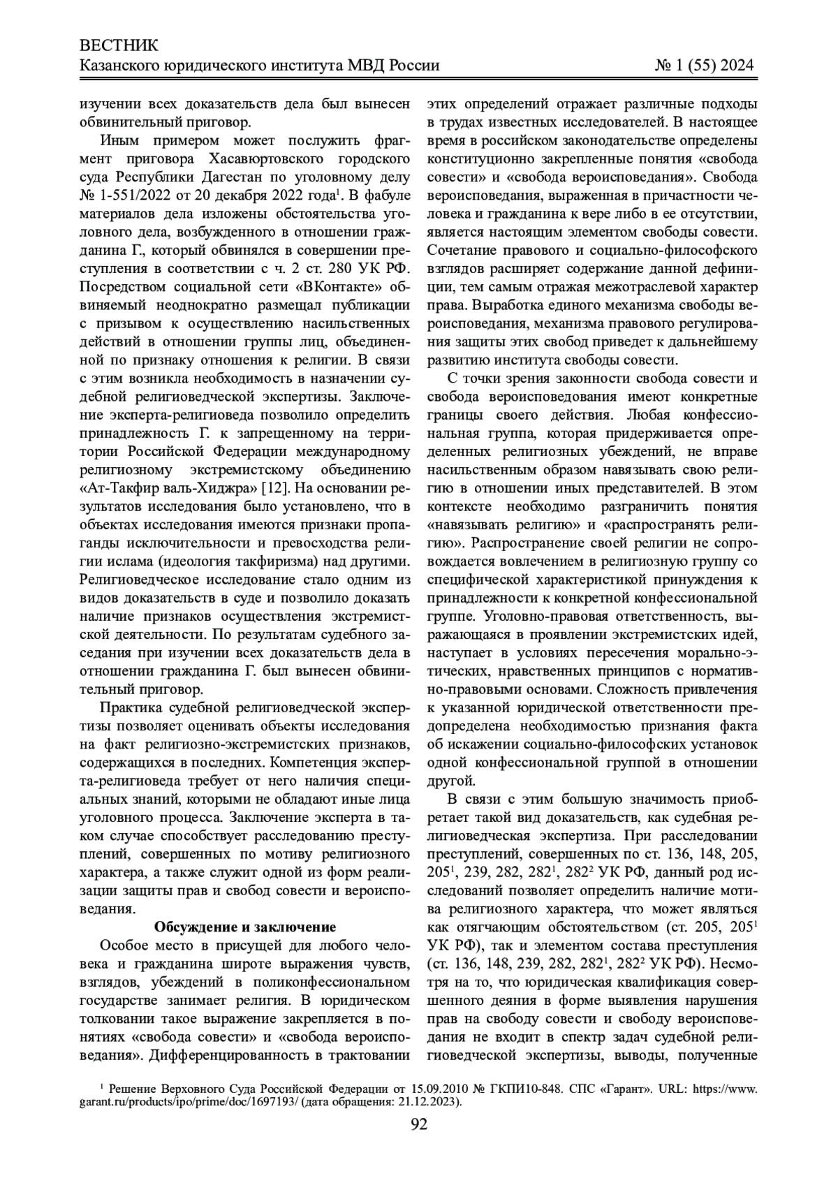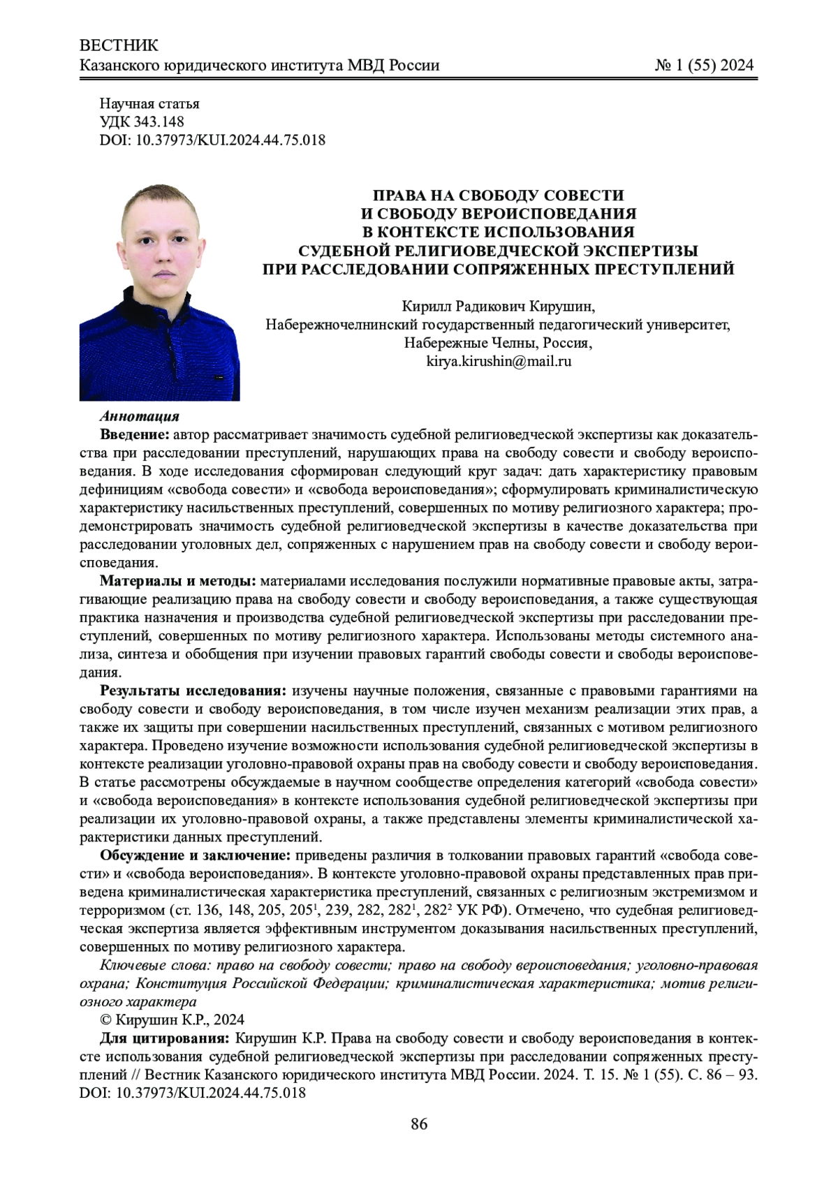Обсуждение и заключение: приведены различия в толковании правовых гарантий «свобода совести» и «свобода вероисповедания». В контексте уголовно-правовой охраны представленных прав приведена криминалистическая характеристика преступлений, связанных с религиозным экстремизмом и терроризмом (ст. 136, 148, 205, 2051, 239, 282, 2821, 2822 УК РФ). Отмечено, что судебная религиоведческая экспертиза является эффективным инструментом доказывания насильственных преступлений, совершенных по мотиву религиозного характер