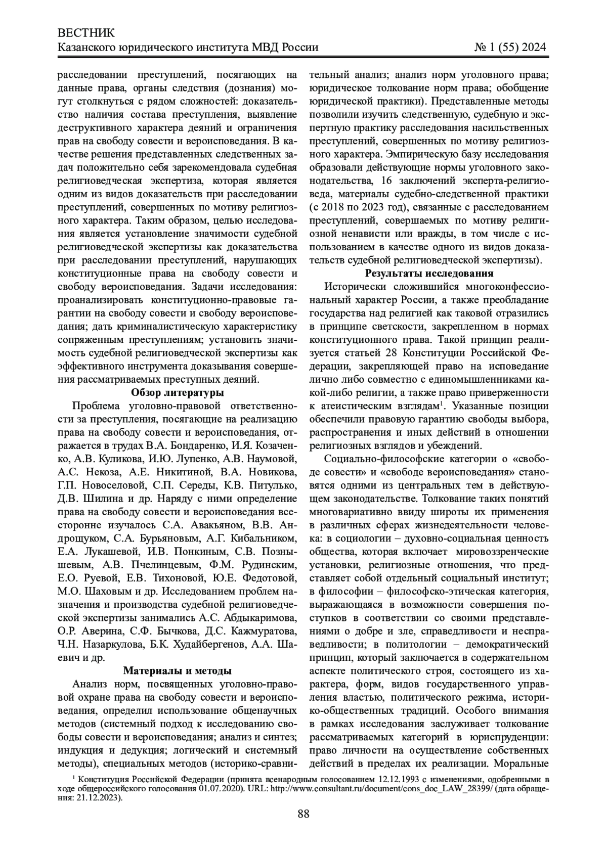 Материалы и методы: материалами исследования послужили нормативные правовые акты, затрагивающие реализацию права на свободу совести и свободу вероисповедания, а также существующая практика назначения и производства судебной религиоведческой экспертизы при расследовании преступлений, совершенных по мотиву религиозного характера. Использованы методы системного анализа, синтеза и обобщения при изучении правовых гарантий свободы совести и свободы вероисповедания.