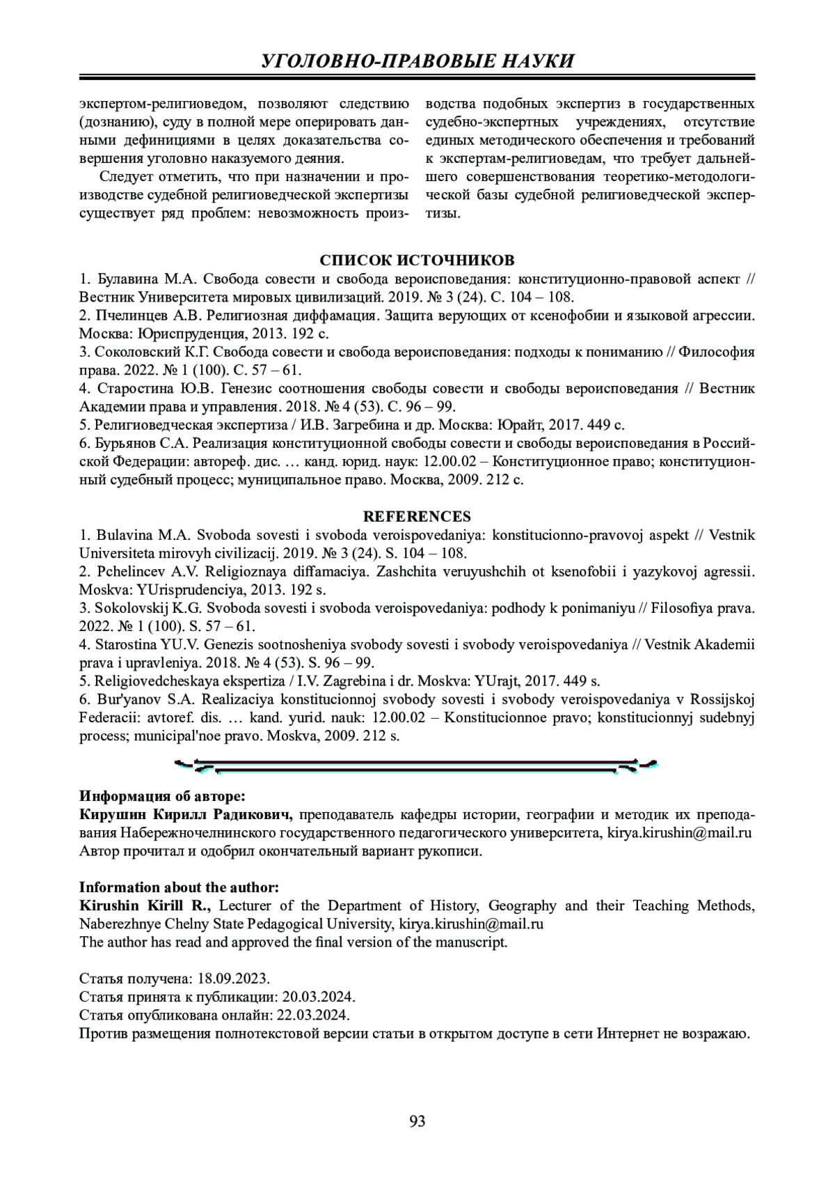 1. 	Булавина М.А. Свобода совести и свобода вероисповедания: конституционно-правовой аспект // Вестник Университета мировых цивилизаций. 2019. № 3 (24). С. 104 - 108. EDN: SORGGH