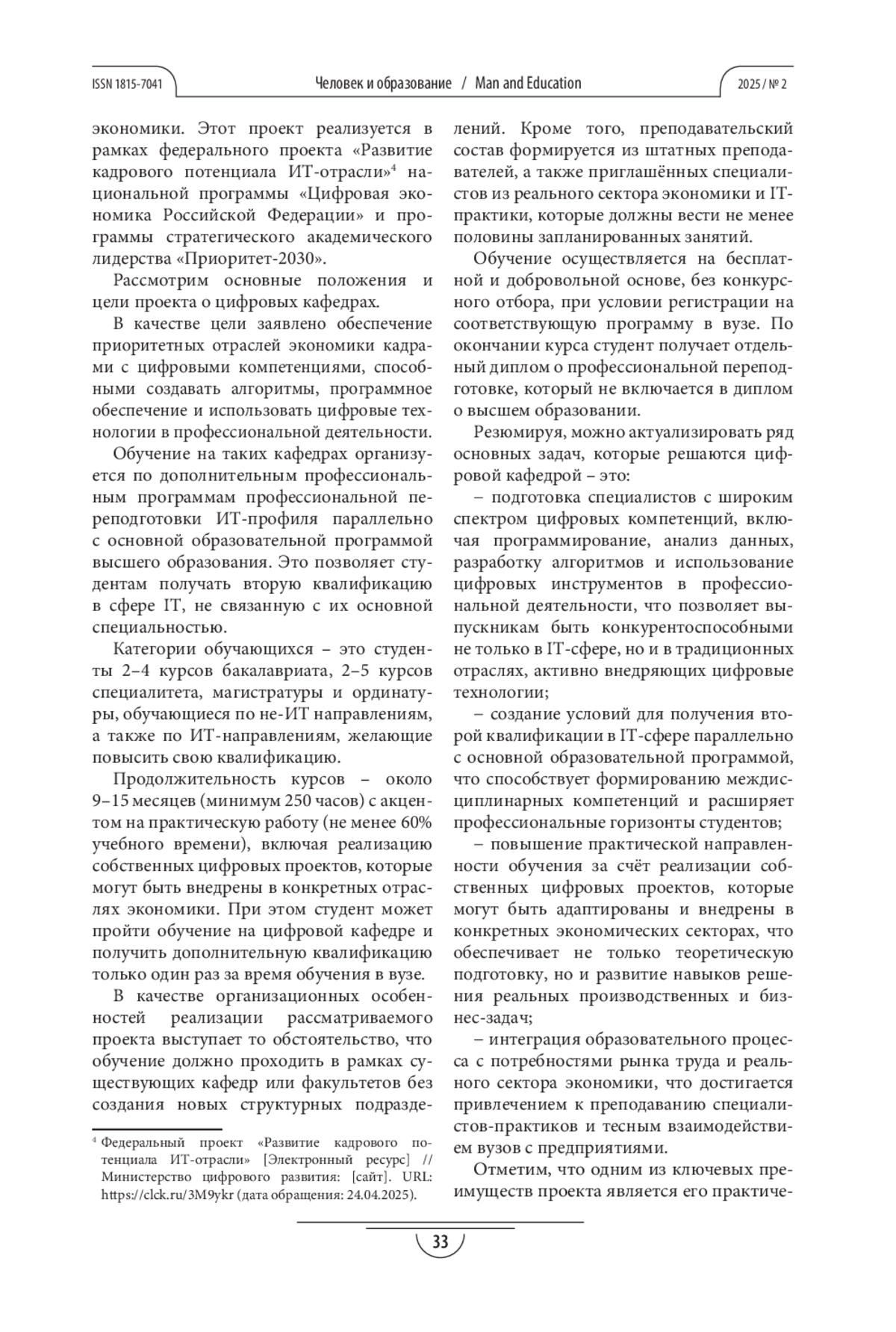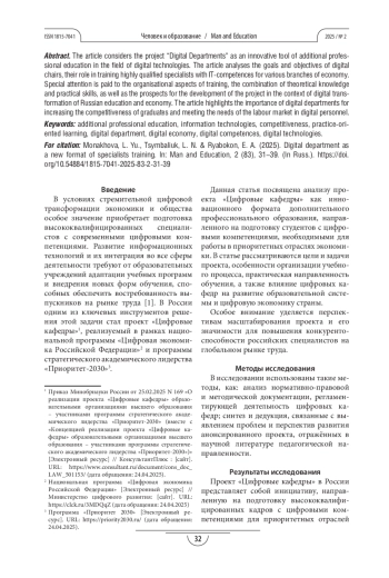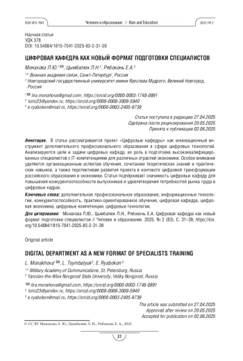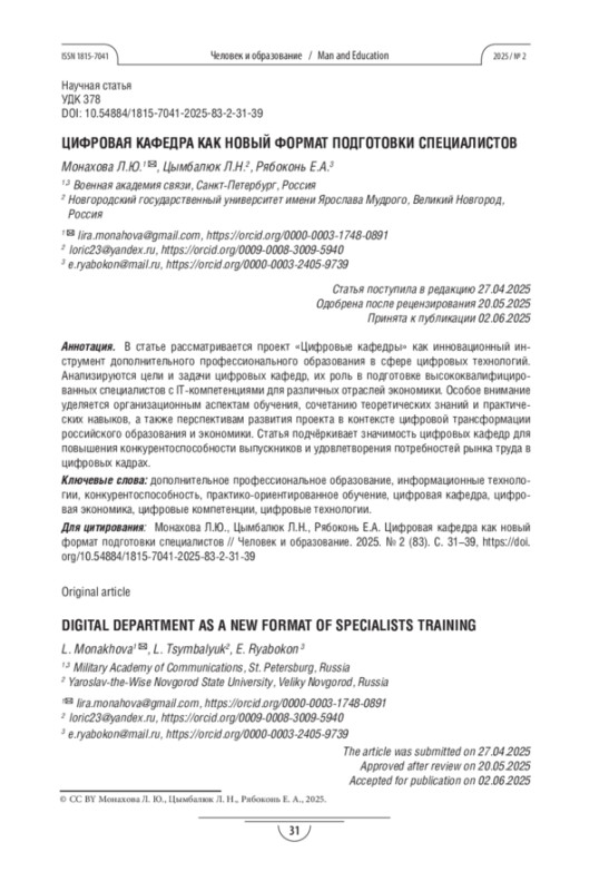 3. Лавренова Е.В., Теплякова А.Ю. Цифровые кафедры // Вестник МГПУ. Серия: Информатика и информатизация образования. 2024. № 1 (67). С. 41-42.